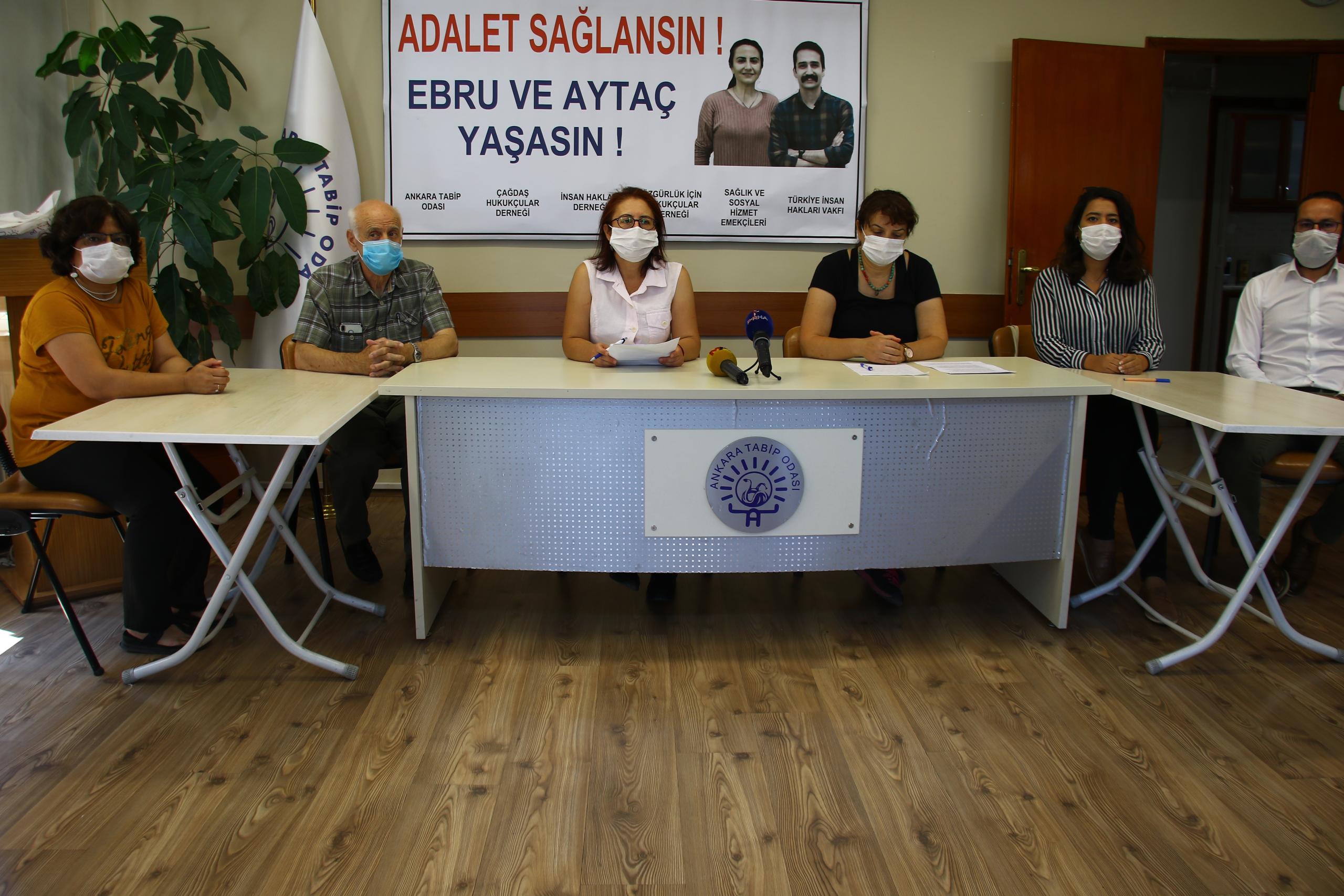 5 Nisan Avukatlar Günü’nden bu yana adil yargılanma talebiyle ölüm orucunda bulunan Avukat Ebru Timtik ve Aytaç Ünsal için ortak basın toplantısı düzenledi. Koronavirüs (Kovid-19) tedbirlerini gereğince fiziki mesafeye dikkat edilerek gerçekleşen toplantı salonuna “Adalet sağlansın Ebru ve Aytaç yaşasın” pankartı asıldı.