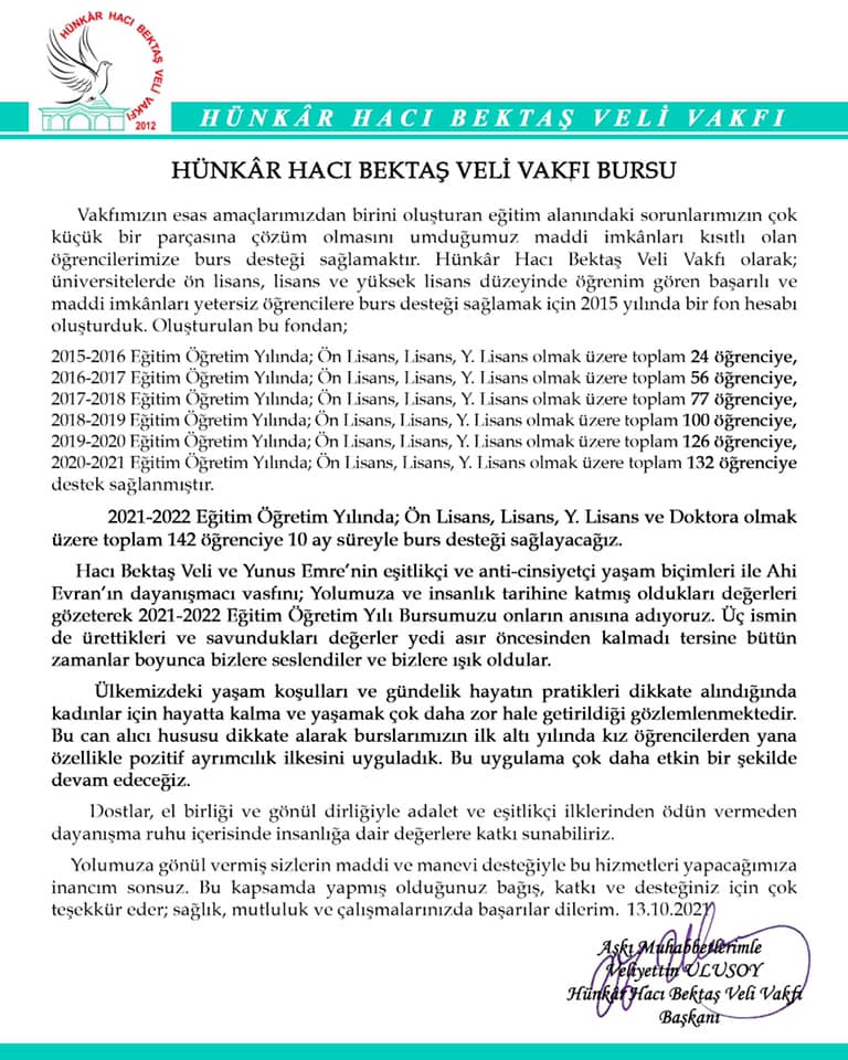 “Hacı Bektaş Veli ve Yunus Emre’nin eşitlikçi ve anti-cinsiyetçi yaşam biçimleri ile Ahi Evran’ın dayanışmacı vasfını; Yolumuza ve insanlık tarihine katmış oldukları değerleri gözeterek 2021-2022 Eğitim Öğretim Yıll Bursumuzu onların anısına adıyoruz. Üç ismin de ürettikleri ve savundukları değerler yedi asır öncesinden kalmadı tersine bütün zamanlar boyunca bizlere seslendiler ve Işık oldular.