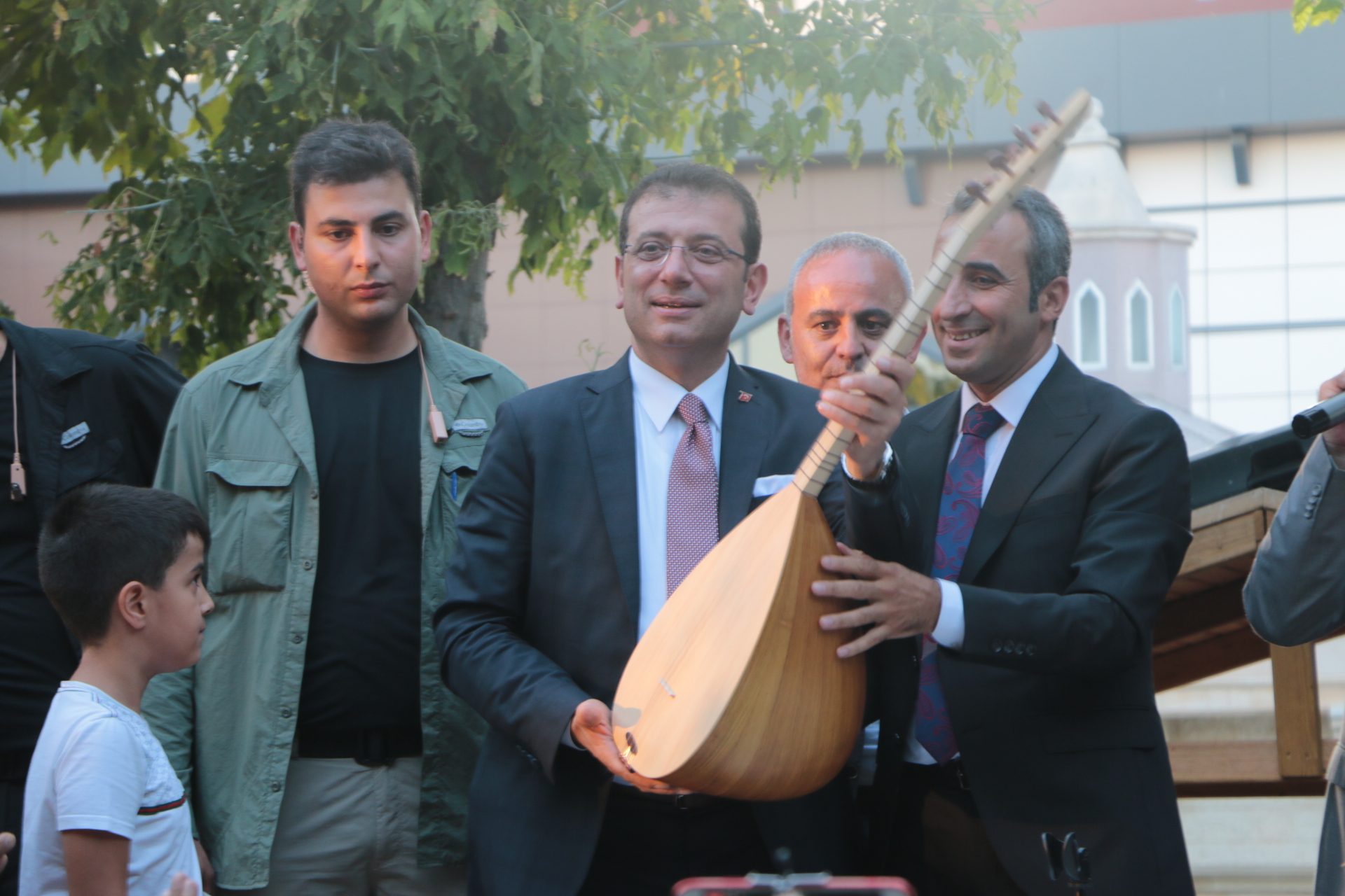Konuşmaların ardından İmamoğlu’na bağlama hediye edildi.