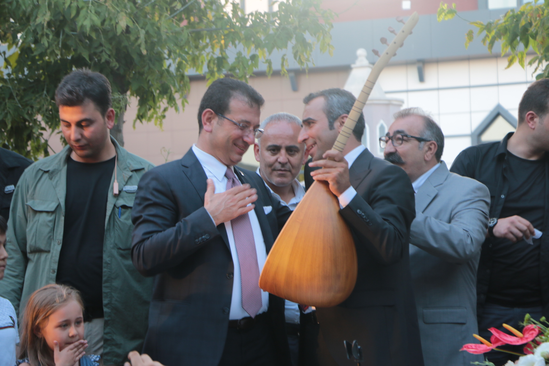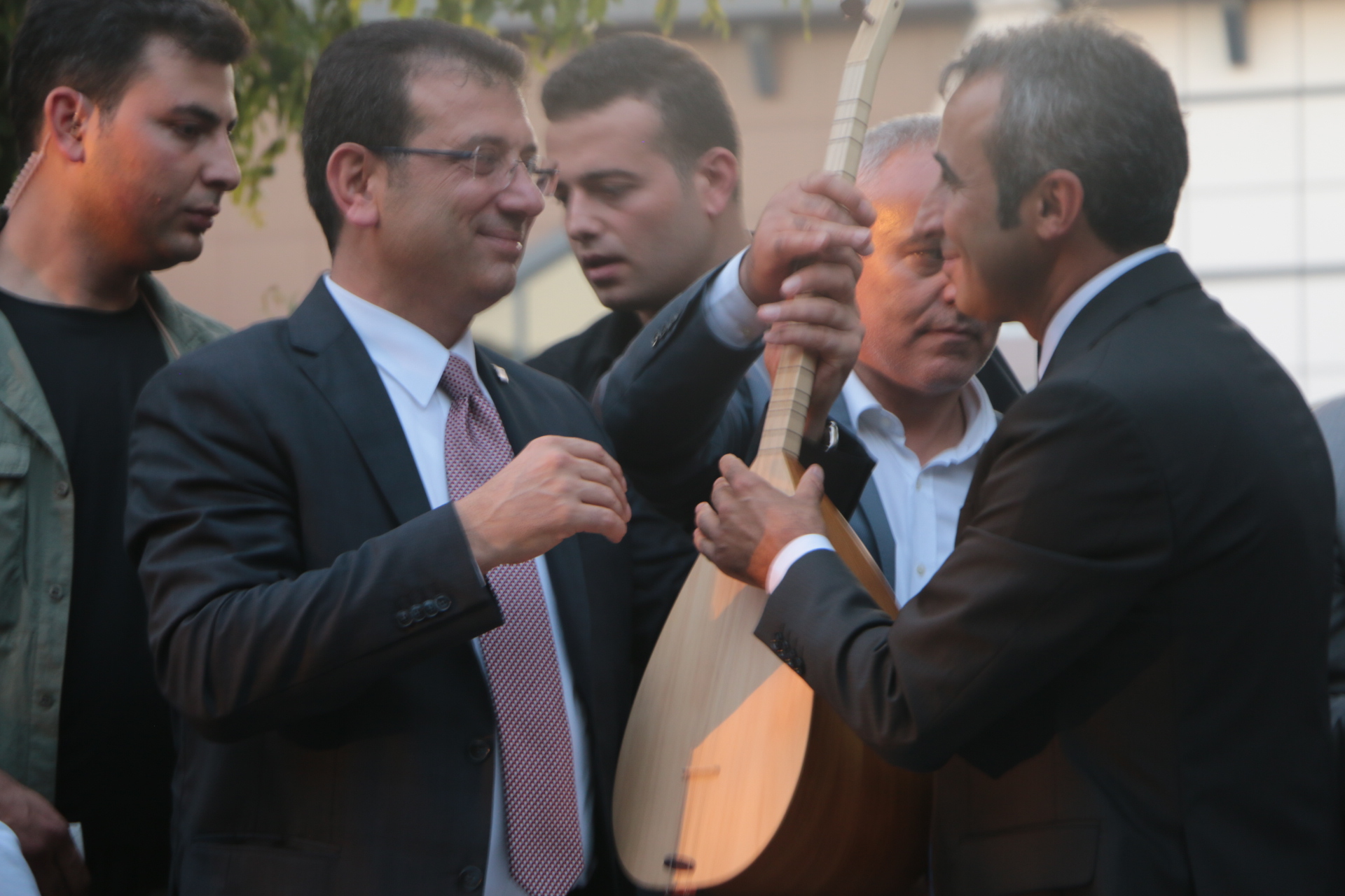 Konuşmaların ardından İmamoğlu’na bağlama hediye edildi.