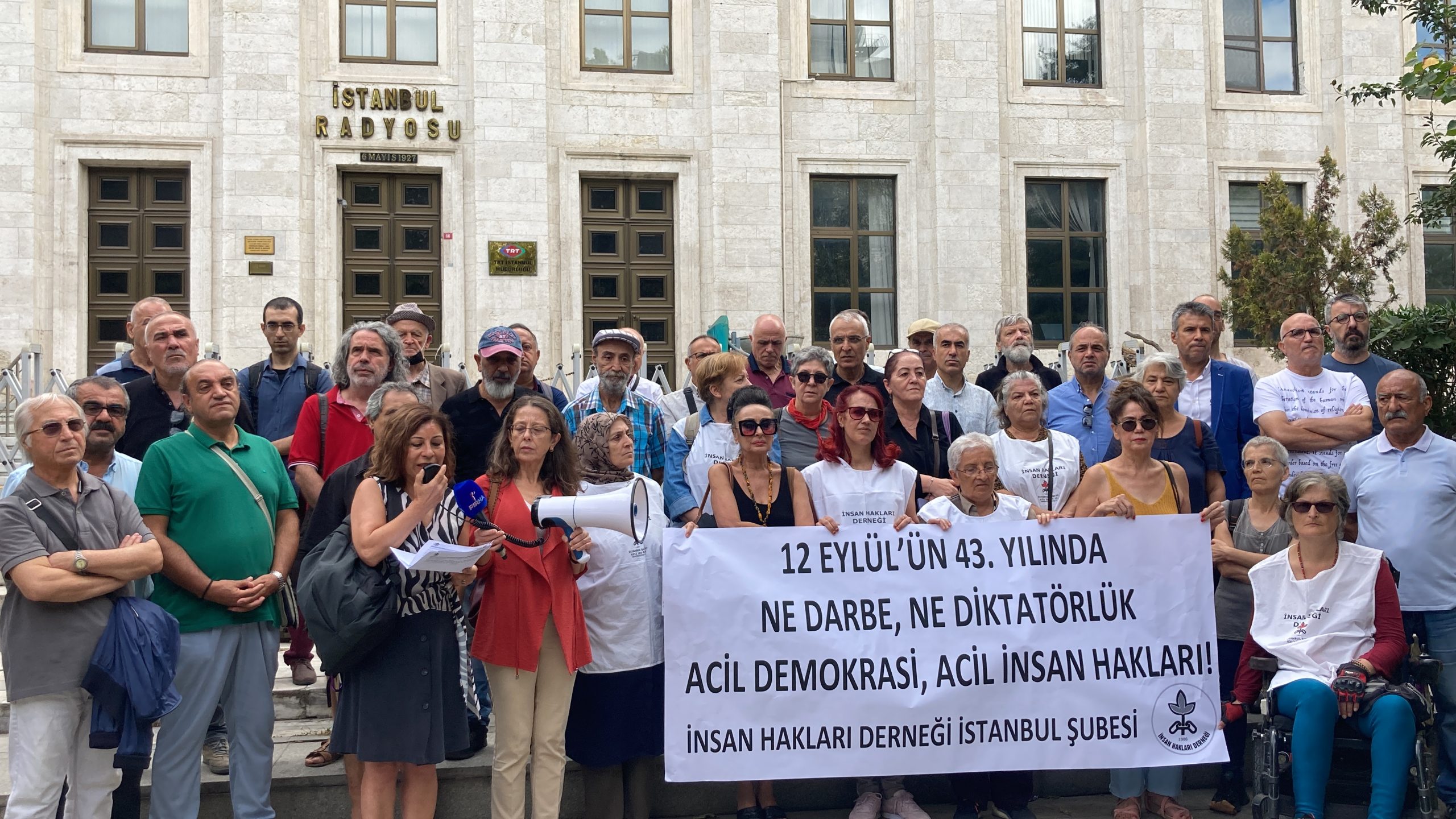 İnsan Hakları Derneği (İHD) İstanbul Şubesi 12 Eylül 1980 Darbesi’nin ilan edildiği TRT İstanbul Radyosu önünde basın açıklaması yaptı. 12 Eylül askeri darbesinin 43. yıl dönümünde İHD İstanbul Şube Başkanı Gülseren Yoleri tarafından okunan metinde şu ifadelere yer verildi: