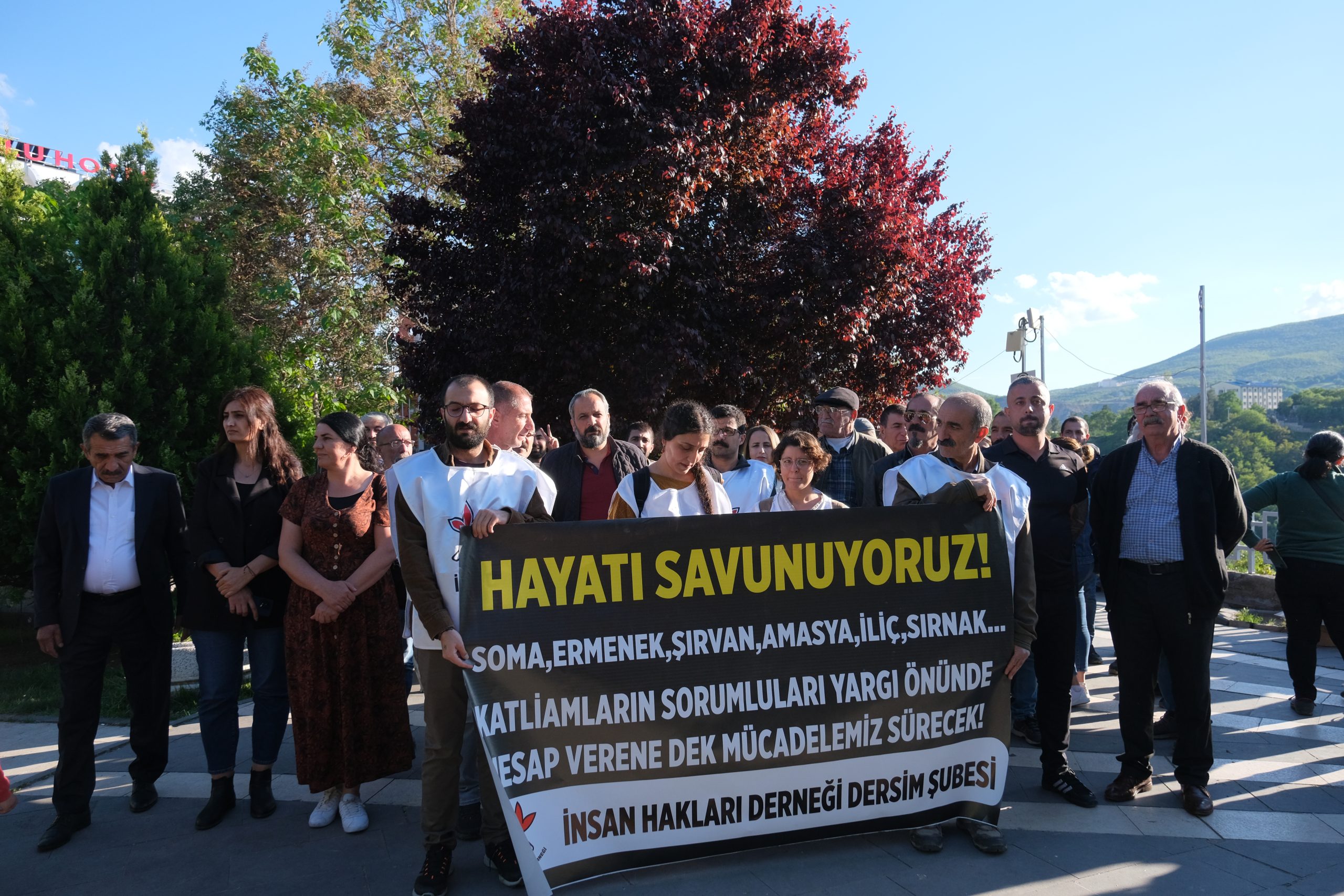 Basın açıklamasını İHD Dersim Şubesi Yöneticisi Nilüfer Aktağ okudu. Açıklamada, “Soma, Ermenek, Şirvan, Amasra, Şırnak, İliç… Katliamların sorumluları yargı önünde hesap verene dek mücadelemiz sürecek” pankartı açıldı.