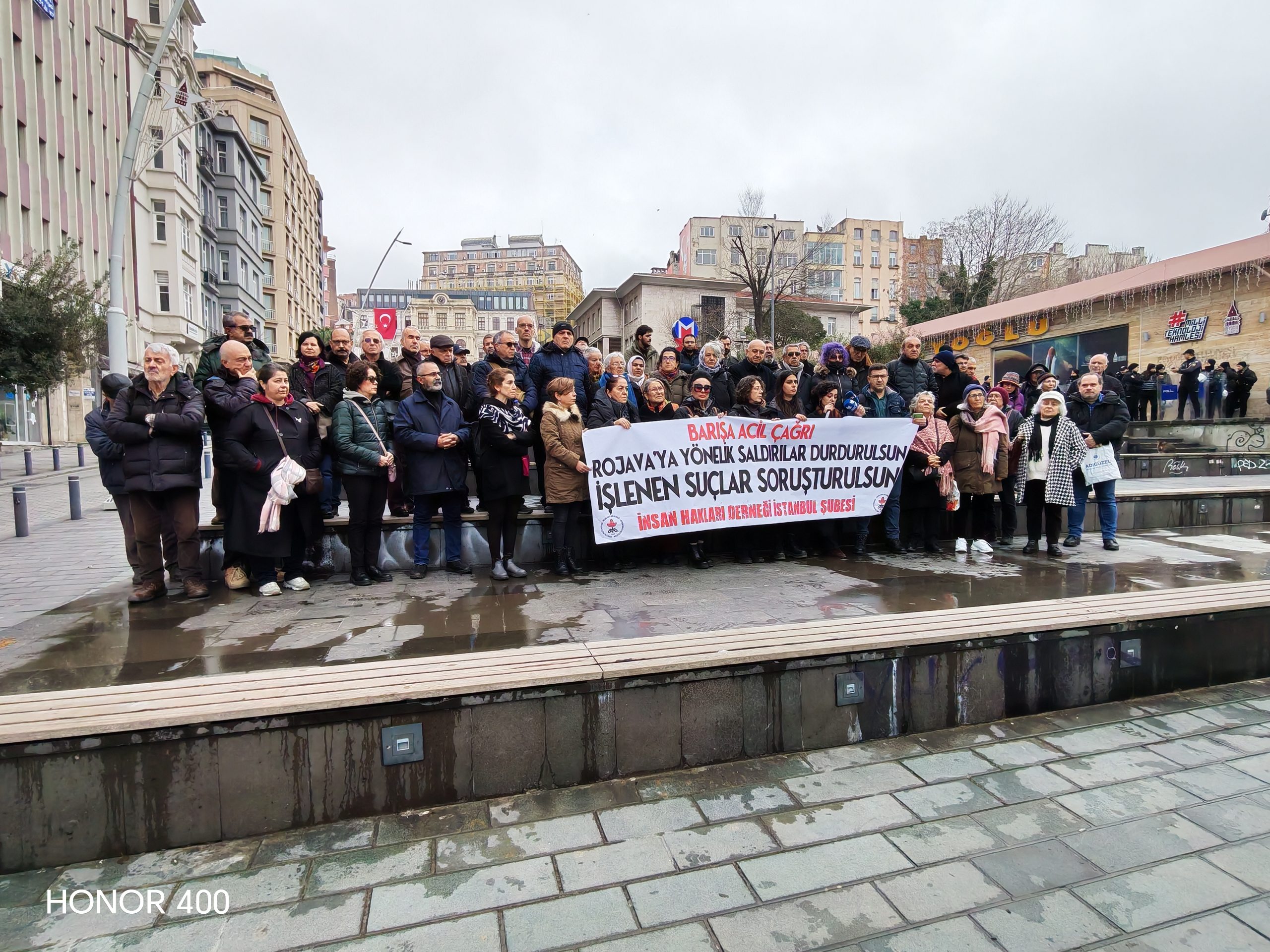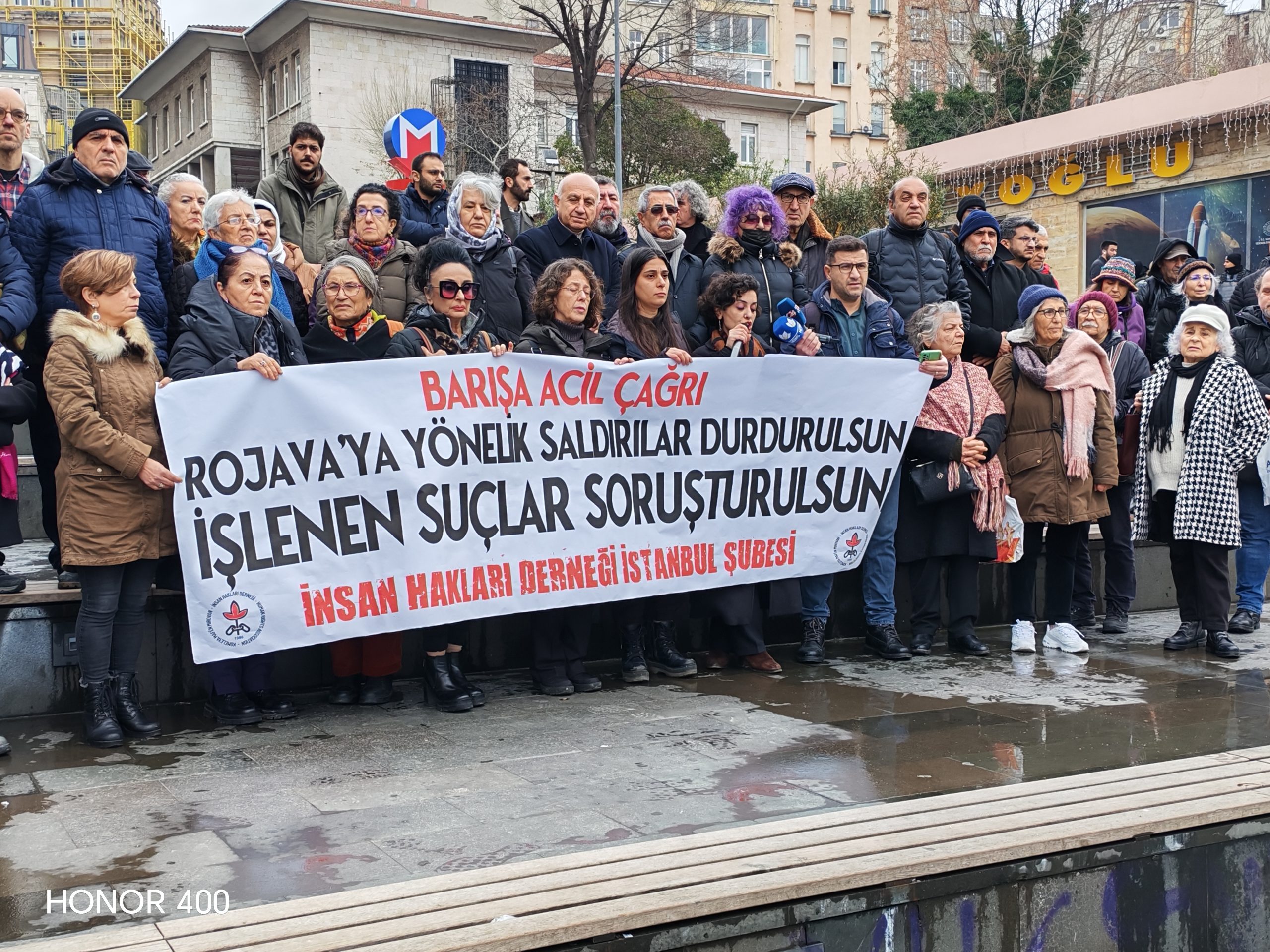 İstanbul’da yapılan açıklama Şişhane Meydanı’nda yapıldı. İHD Şube Eş Başkanı Jiyan Tosun tarafından okunan açıklamada, Kuzey ve Doğu Suriye’de yaşanan saldırılar; insan onurunun korunması konusunda yerel ve uluslararası kamuoyuna büyük bir sorumluluk yüklendiği ifade edildi. HTŞ tarafından oluşturulan Geçici Suriye yönetimine, Suriye’de yaşayan Kürtlerin, Alevilerin, Dürzilerin, Süryanilerin ve kendilerince “makbul kabul edilmeyen” bütün halkların yaşam hakkına yönelik saldırılardan derhal vazgeçmesi çağrısında bulunuldu.