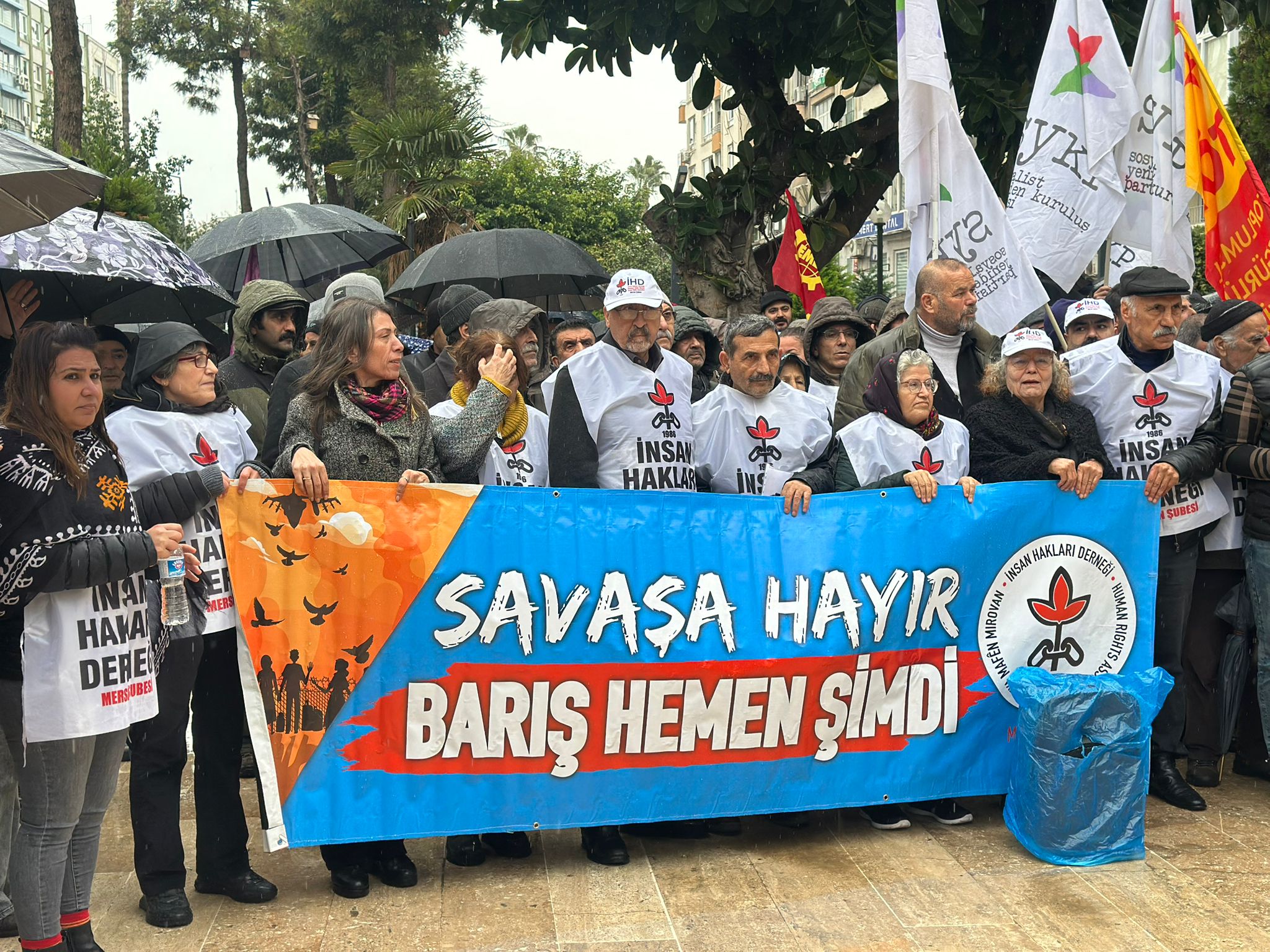 Mersin’de yapılan açıklama Özgür Çocuk Parkı’nda yapıldı. Polis ablukası altından yapılan açıklamayı İHD Şube Eş Başkanı Zeynep Kaya okurken, açıklamaya siyasi parti ve demokratik kitle örgütü temsilcileri destek verdi. Zeynep Kaya, Kuzey ve Doğu Suriye’de yaşanan saldırılar; insan onurunun korunması konusunda yerel ve uluslararası kamuoyuna büyük bir sorumluluk yüklediğine dikkat çekerek,”Bu süreçte sivillerin hedef alınması, yerel nüfusun zorla yerinden edilmesi, işkence ve kötü muamele uygulamaları, esir alınan silahlı militanların infaz edilmesi gibi uluslararası belgelerde savaş suçu olarak tanımlanan pek çok fiile tanıklık etmekteyiz” dedi.