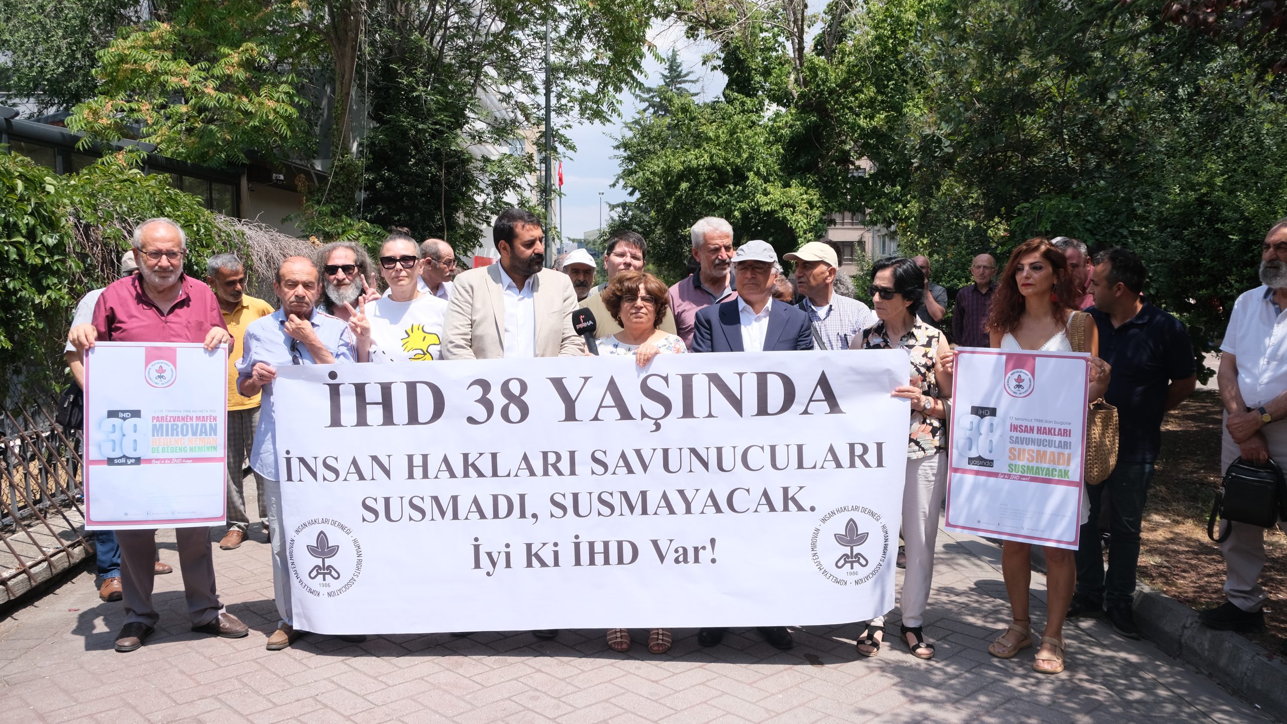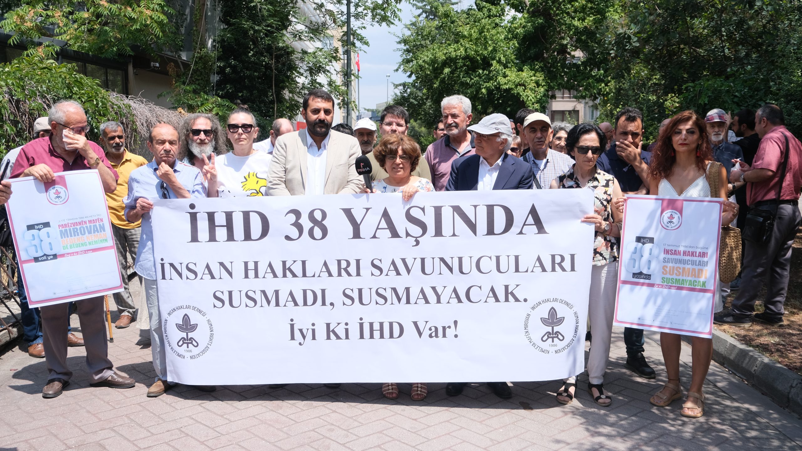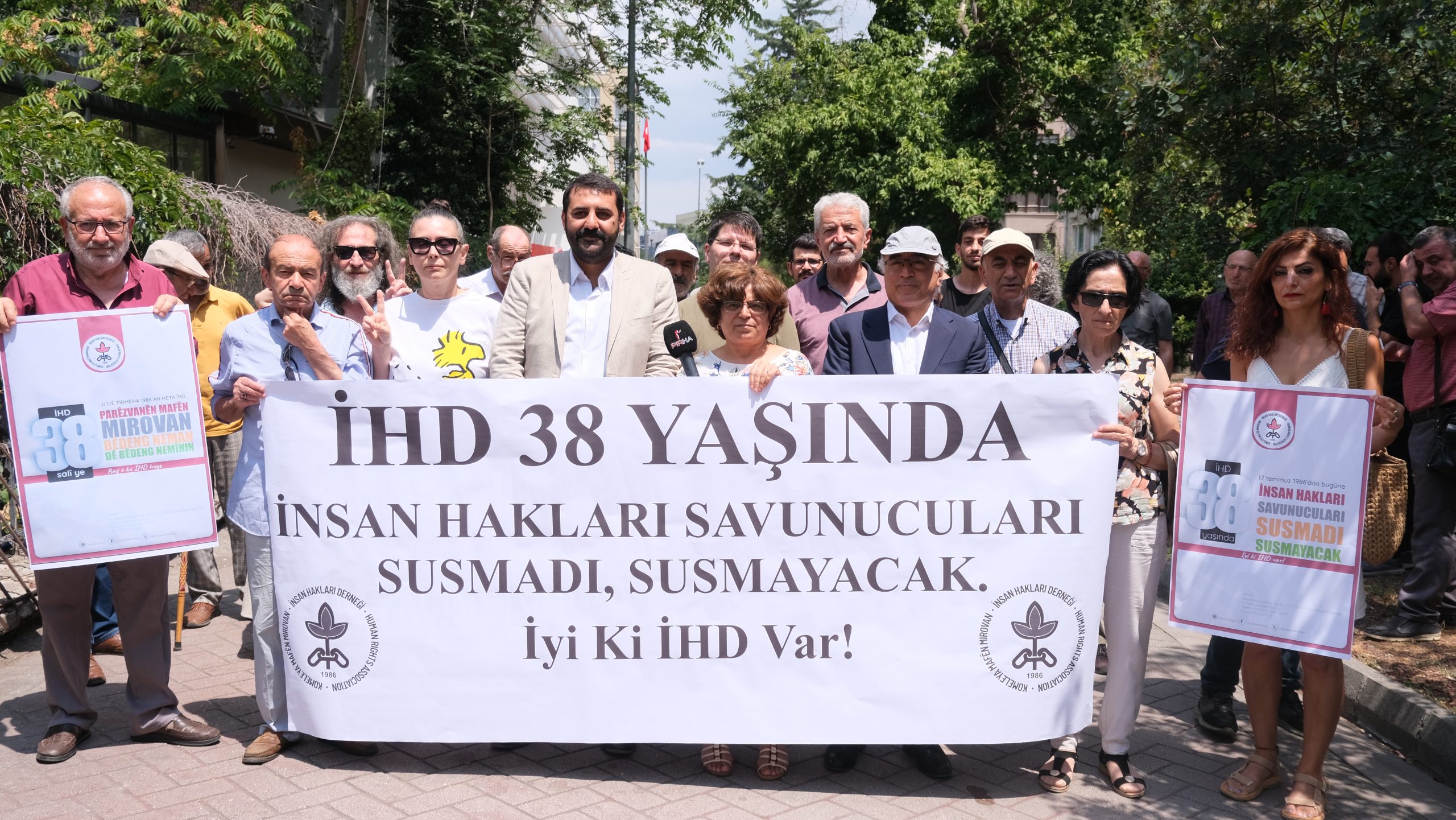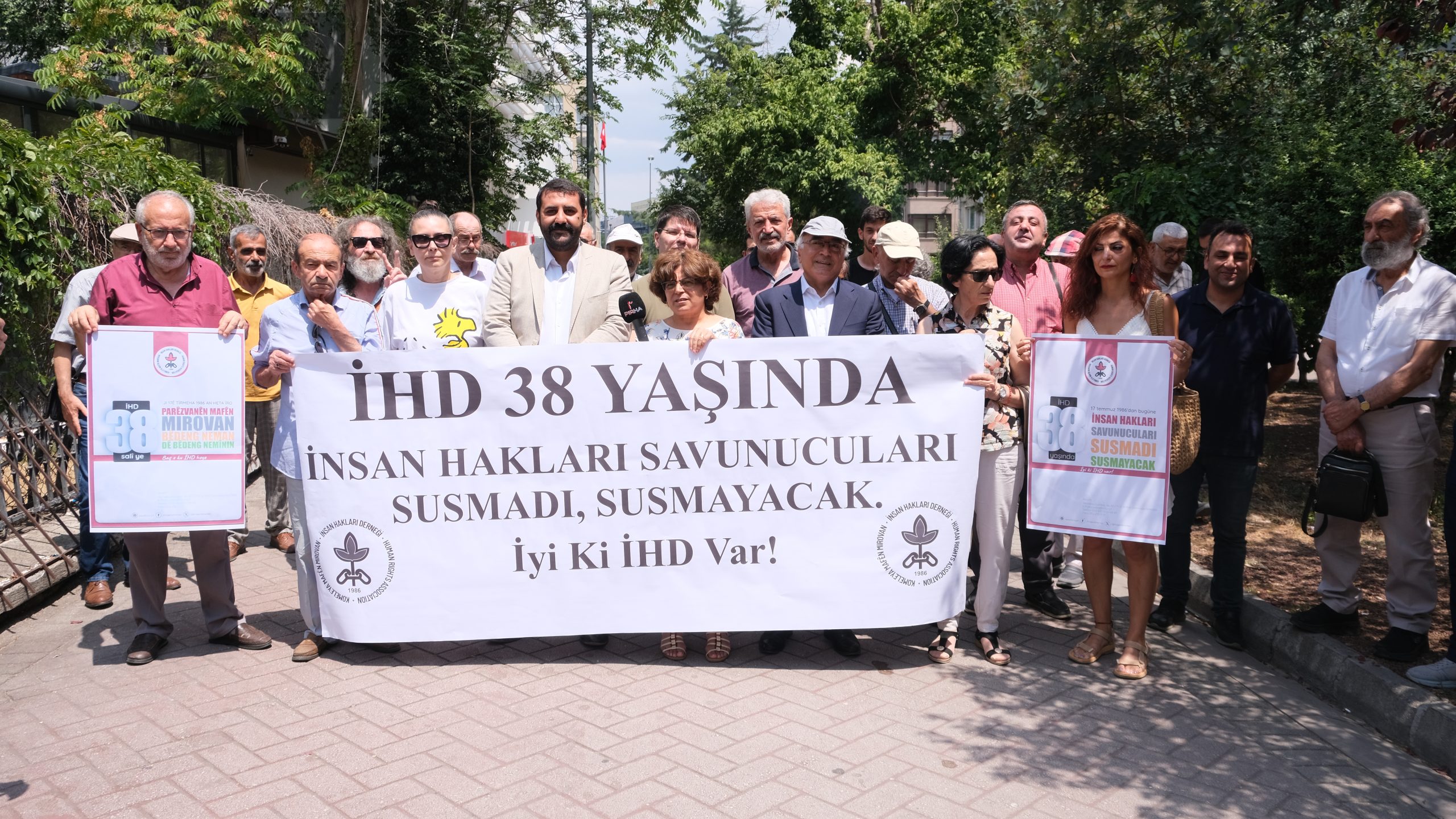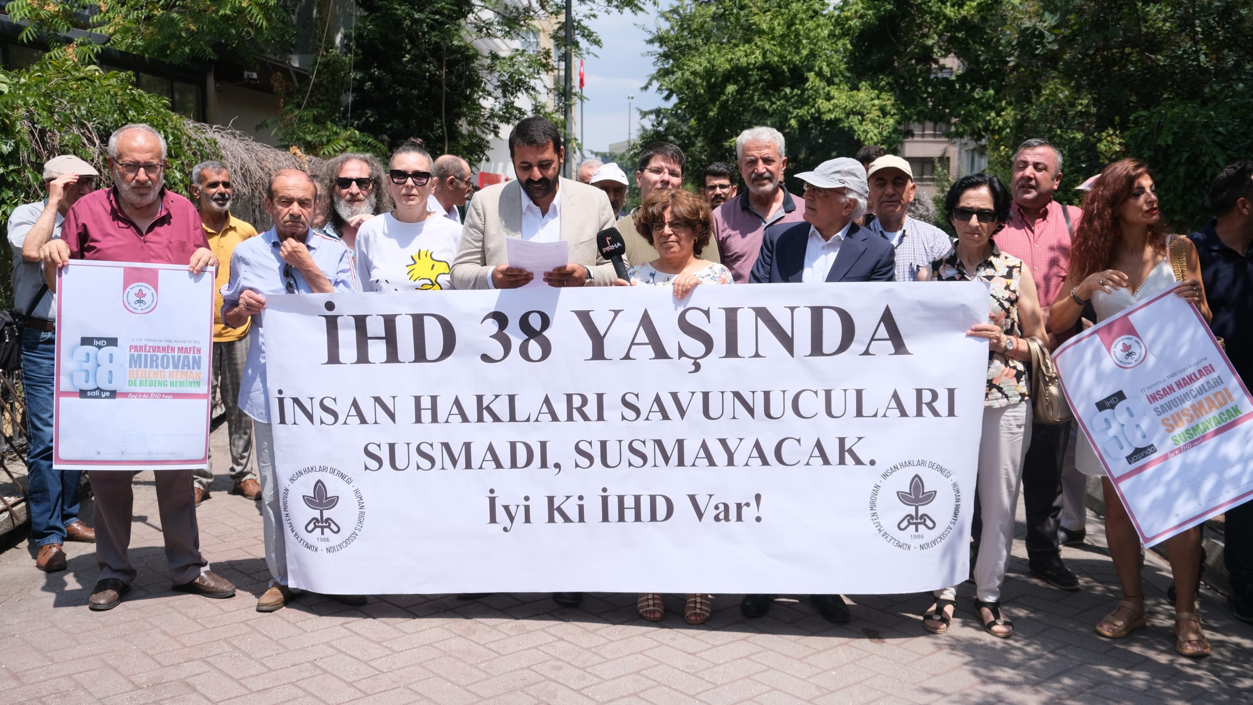 Açıklamanın ardından konuşan DEM Parti Hukuk Komisyonu Eş Sözcüsü Öztürk Türkdoğan da “Elbette bir siyasi kimliğimiz var ama biz siyasi faaliyete geçmeden önce insan hakları mücadelesi vererek ve gerçekten bu topraklarda insan hakları ve demokrasi sorununu siyasal ve insan hakları mücadelesiyle çözüleceğine olan inancımızla bu mücadeleyi sürdürüyoruz. Dile kolay 38 yıl. İHD kurulduğunda sıkıyönetim vardı Türkiye’de, insan hakları savunucuları demokratik anayasa istiyordu, sivil ve yeni anayasa istiyordu ve tabi ki barış istiyordu. Şimdi aradan 38 yıl geçti daha kötü bir anayasayla hatta anayasasızlık haliyle karşı karşıyayız. Neredeyse kurumsallaşmış yerleşmiş bir fiili Olağan Üstü Hal (OHAL) rejimi ile karşı karşıyayız. Fakat şöyle bir avantajımız var; müthiş bir birikimimiz var. Bir direniş geleneğimiz ve kültürümüz var. Hem insan hakları alanında hem demokratik alanda biriktirdiklerimiz var ve mücadelemizi büyüterek sürdürüyoruz. Bu bakımdan umutluyuz, mücadelemizin sonuç vereceğine inanıyoruz ve bir kuruluştan 38 yıl sonra gerçekten insan hakları savunucularının o inatçı ve kararlı duruşunun ne kadar kıymetli olduğunu sizlerle paylaşmak istiyorum” diye konuştu.