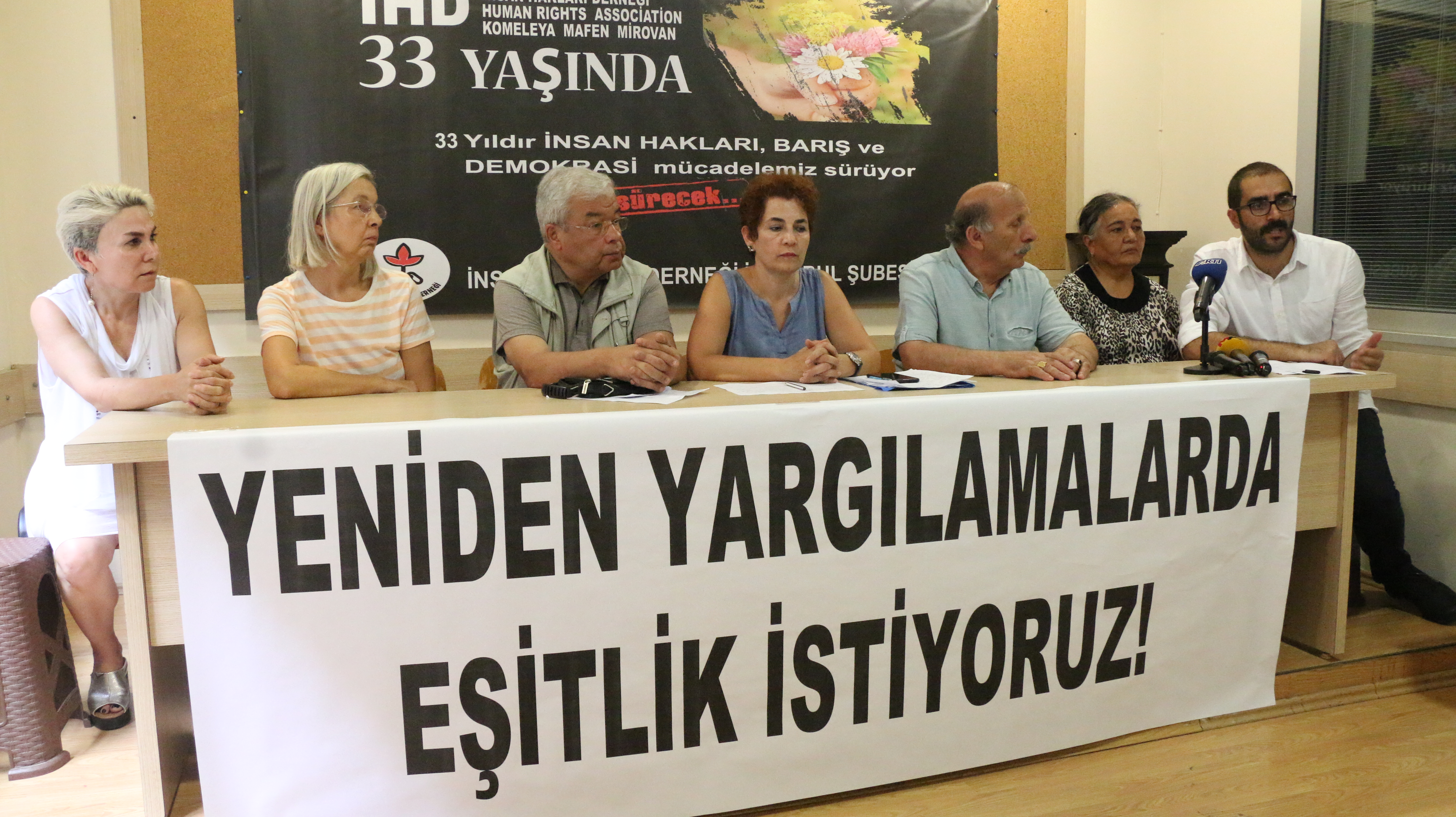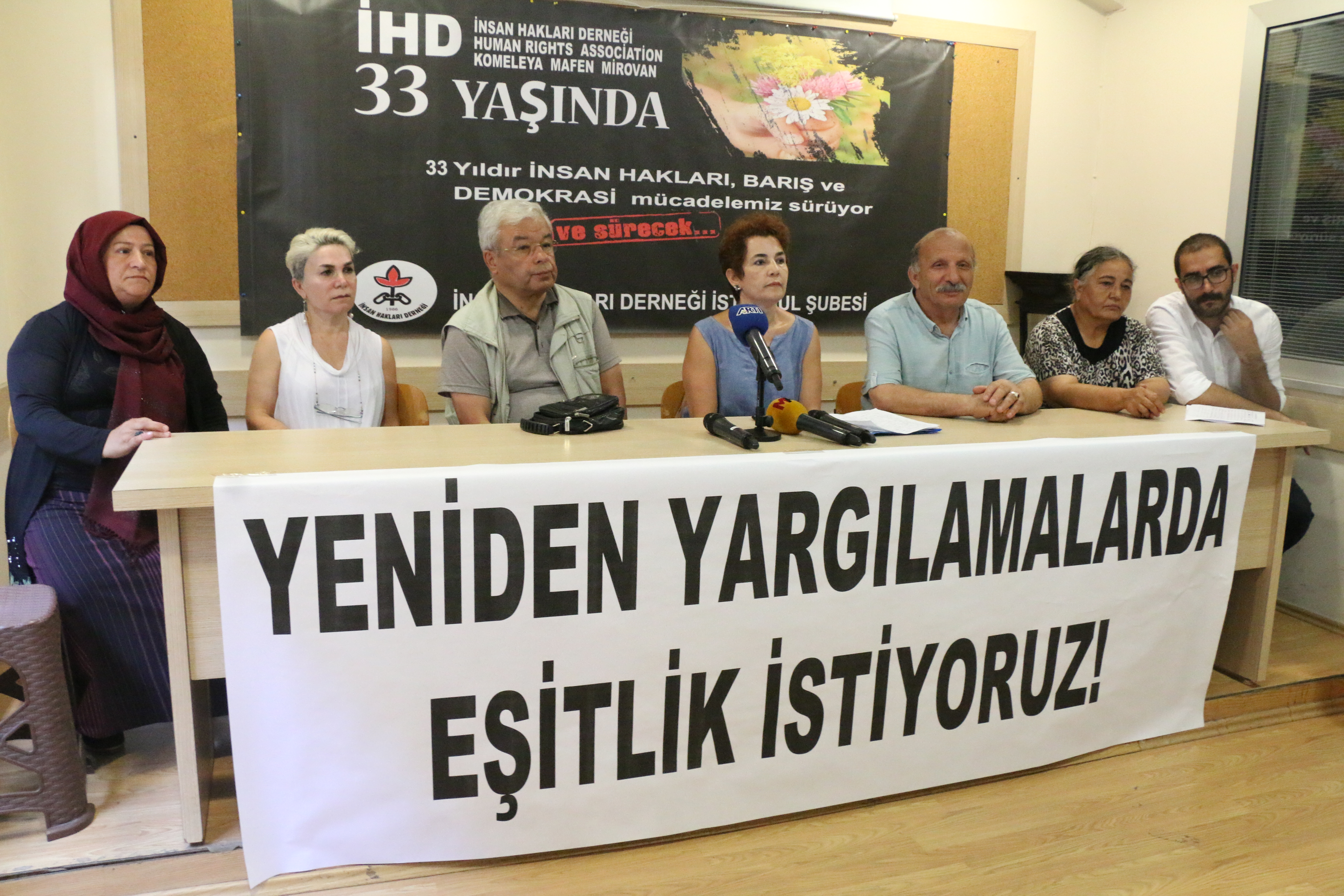 İnsan Hakları Derneği (İHD) İstanbul Şubesi, Devlet Güvenlik Mahkemeleri (DGM) ve Özel Yetkili Mahkemeler’de (ÖYM) yargılan ve ceza alanların infazının durdurulması taleplerine ilişkin yaşanan çifte standartlarla basın toplantısı gerçekleştirdi. Toplantının yapıldığı salona “Yeniden yargılanmalarda eşitlik istiyoruz” pankartı asıldı.