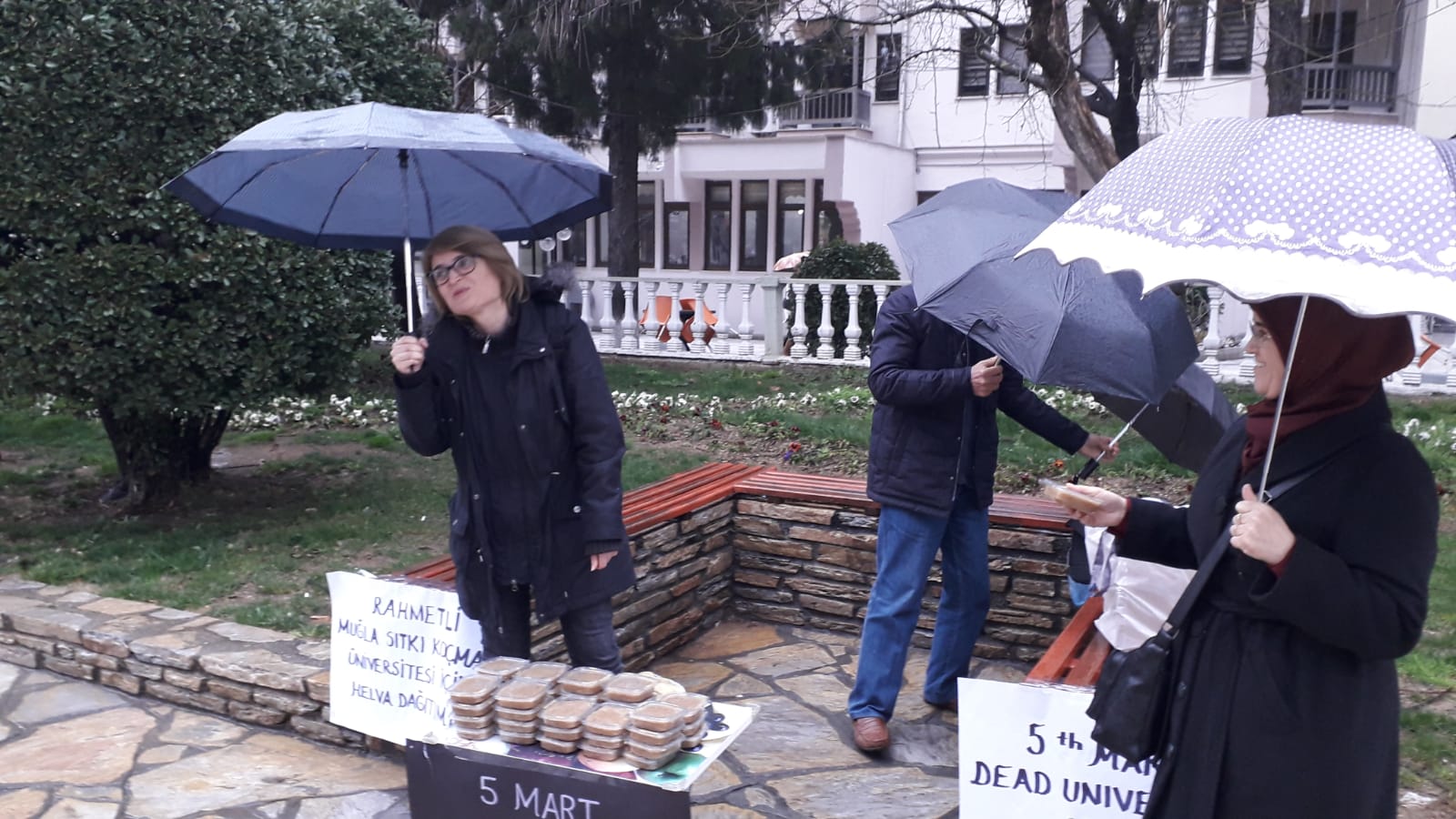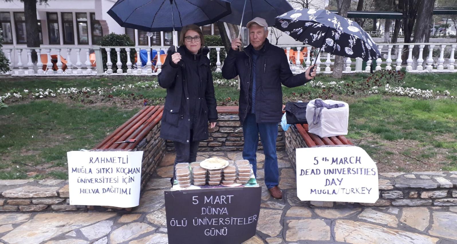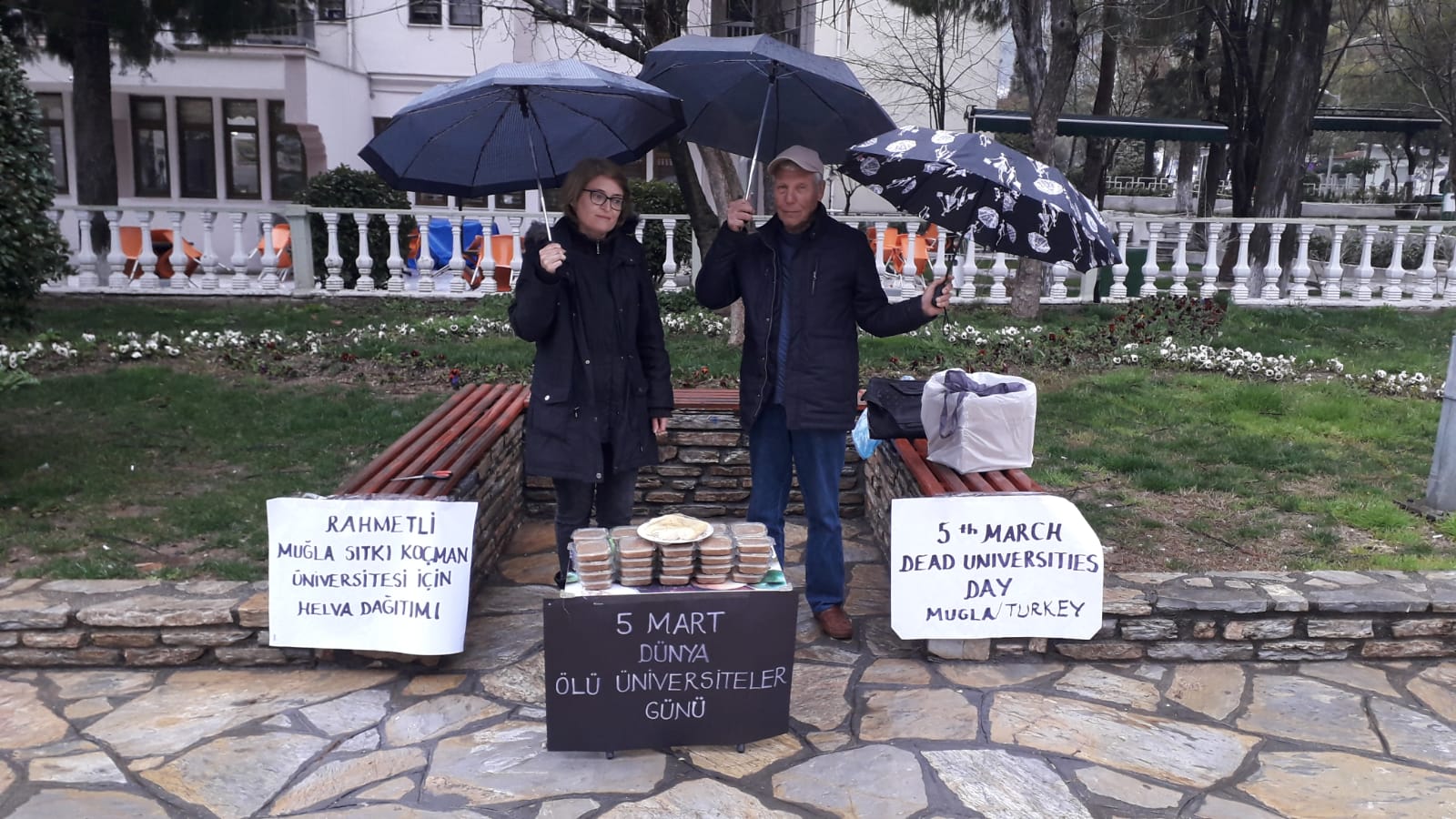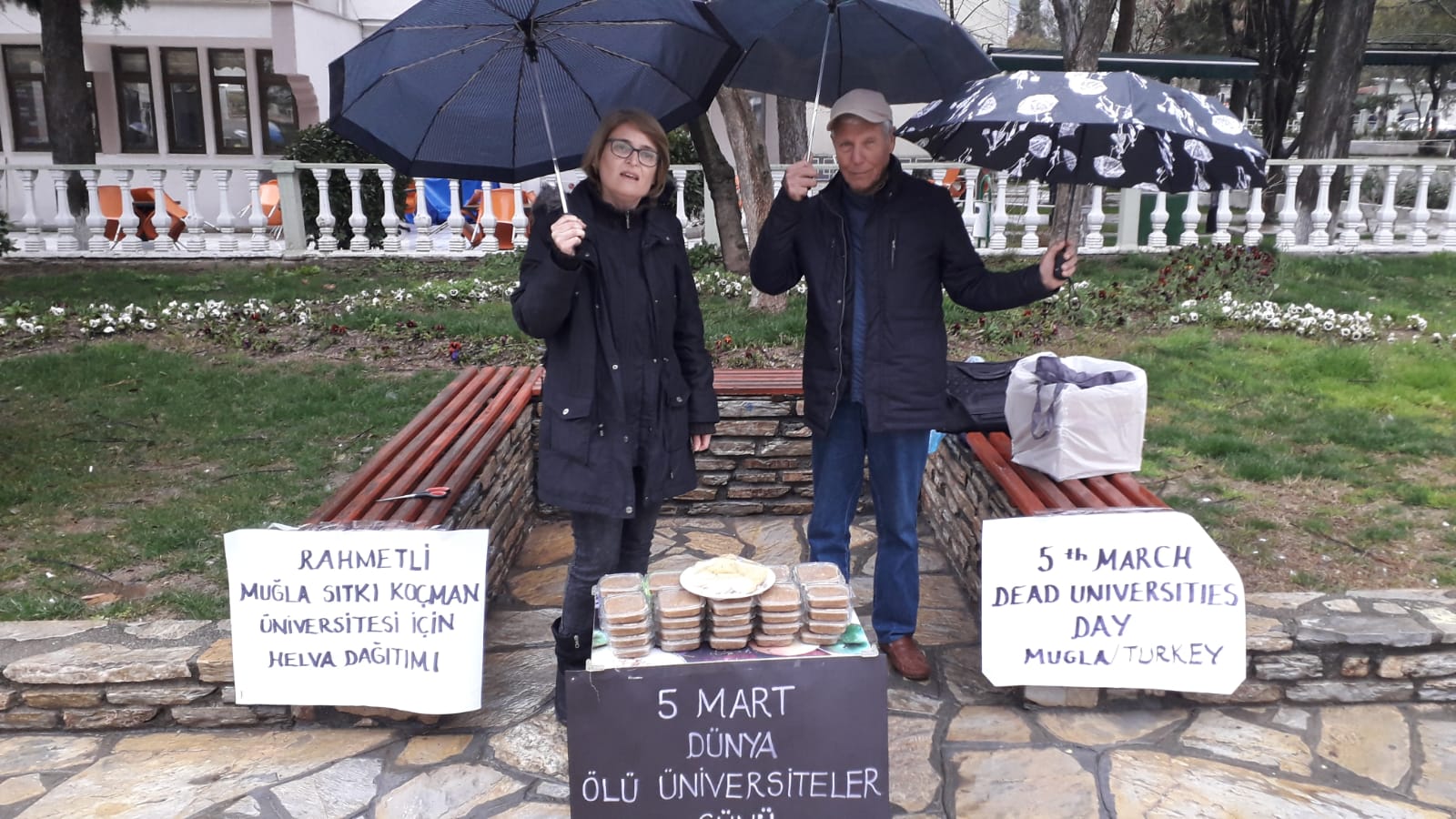 15 Temmuz 2016’da darbe girişimin ardından KHK ile binlerce kamu emekçisi mesleklerinden ihraç edildiler. Muğla Sıtkı Koçman Üniversitesi’nden toplam 6 barış imzacısı akademisyen Kanun Hükmünde Kararname ile ihraç edildi. 29 Nisan 2017’de ihraç edilen Psikolog Gözde Özdikmenli, bugün 5 Mart Dünya Ölü Üniversiteler Günü nedeniyle helva dağıttı.