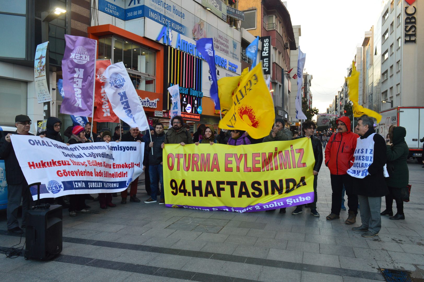İhraç edilen kamu emekçilerinin geri alınması talebiyle Karşıyaka çarşı girişinde oturma eylemi gerçekleştiren Eğitim Sen İzmir 2 No’lu Şube, eylemlerini yağmur, çamur, kar, kış ve soğuk demeden her hafta devam ediyor. Oturma eylemlerinin 94. haftasında bir araya gelen emekçiler sık sık ‘direne direne kazanacağız,’ ‘asla yanlız yürümeyeceksin,’ ‘baskılar bizi yıldıramaz’ sloganları atarak işlerini, öğrencilerini geri istedi.