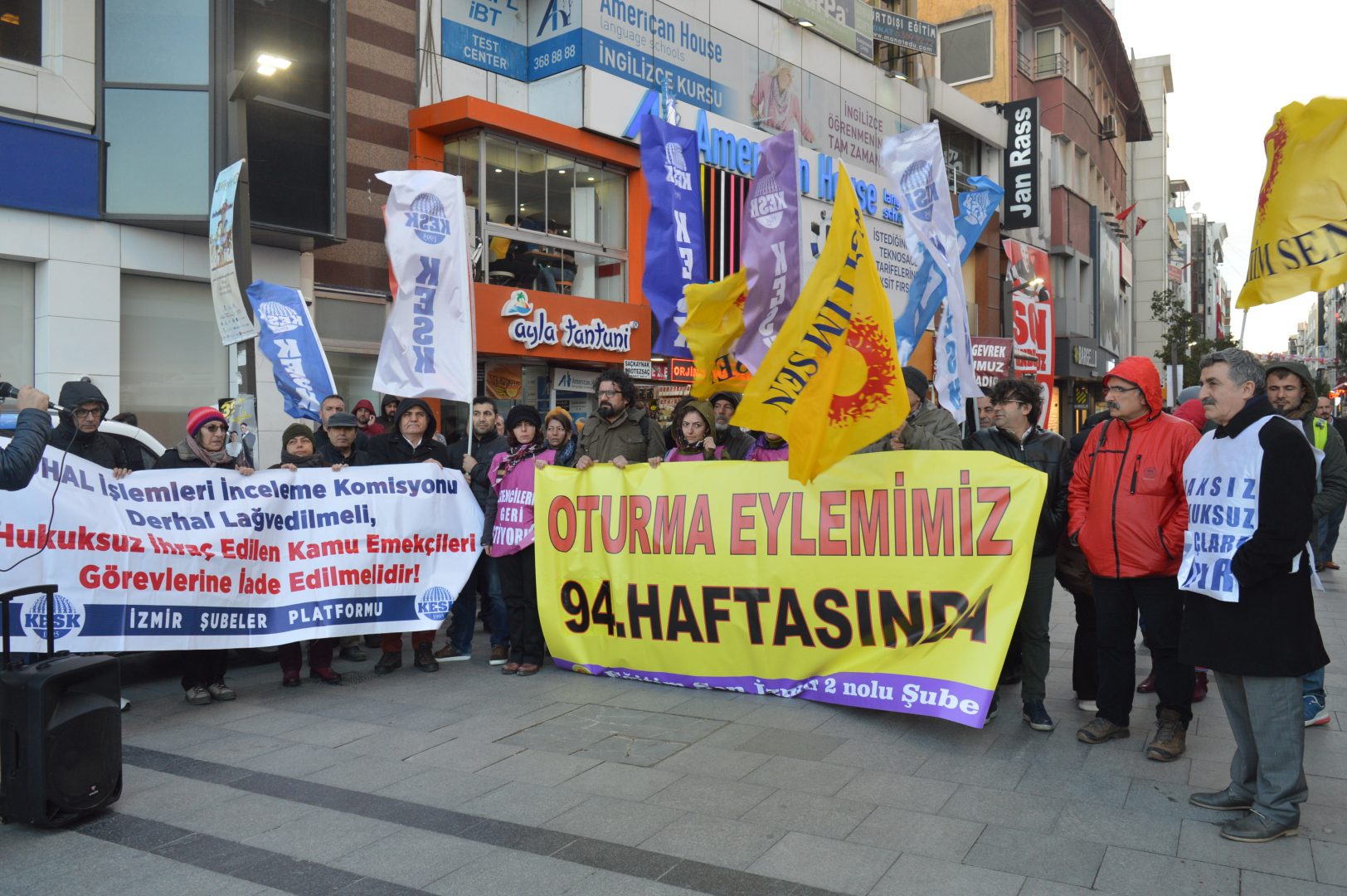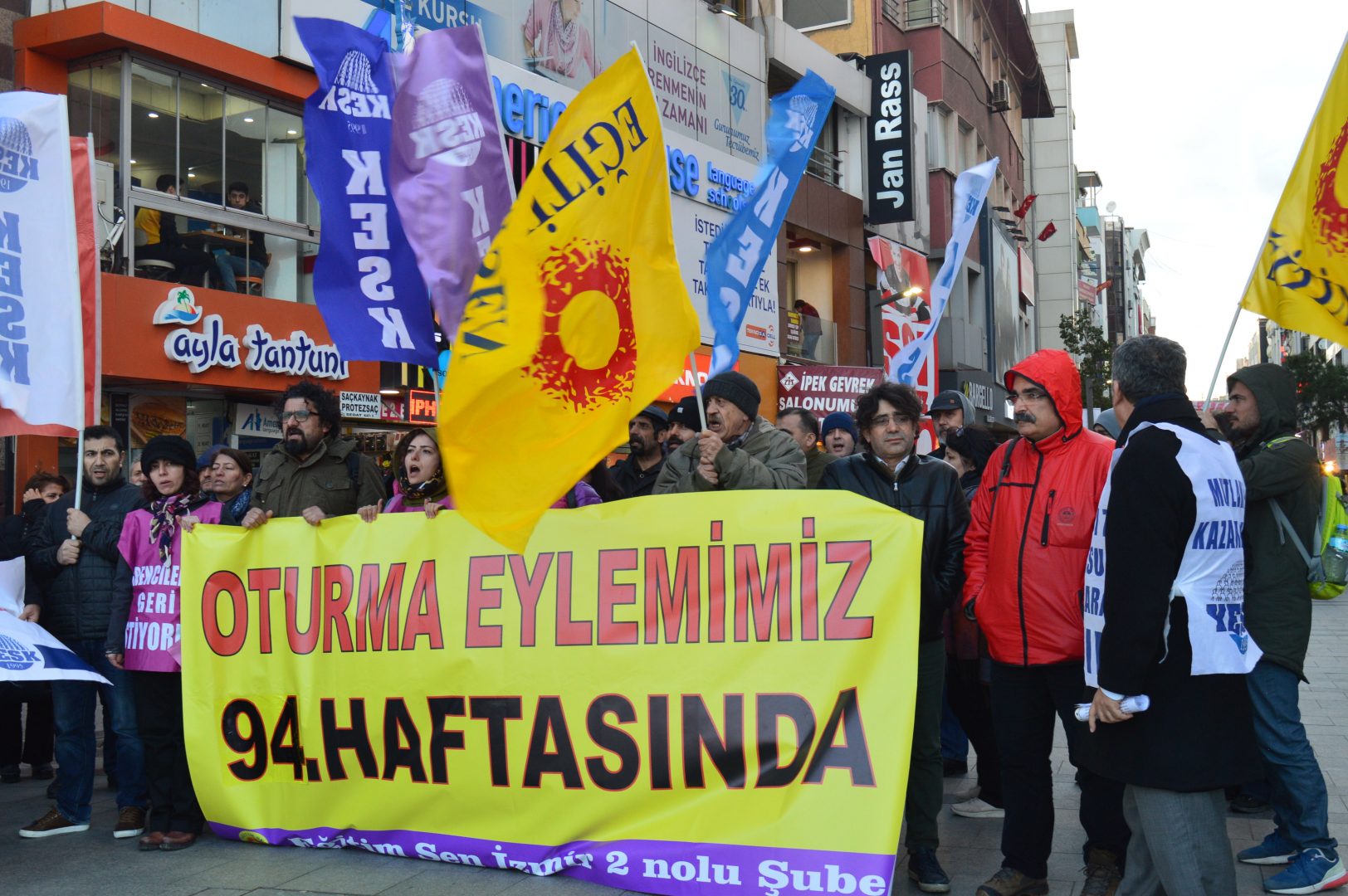 İhraç edilen kamu emekçilerinin geri alınması talebiyle Karşıyaka çarşı girişinde oturma eylemi gerçekleştiren Eğitim Sen İzmir 2 No’lu Şube, eylemlerini yağmur, çamur, kar, kış ve soğuk demeden her hafta devam ediyor. Oturma eylemlerinin 94. haftasında bir araya gelen emekçiler sık sık ‘direne direne kazanacağız,’ ‘asla yanlız yürümeyeceksin,’ ‘baskılar bizi yıldıramaz’ sloganları atarak işlerini, öğrencilerini geri istedi.