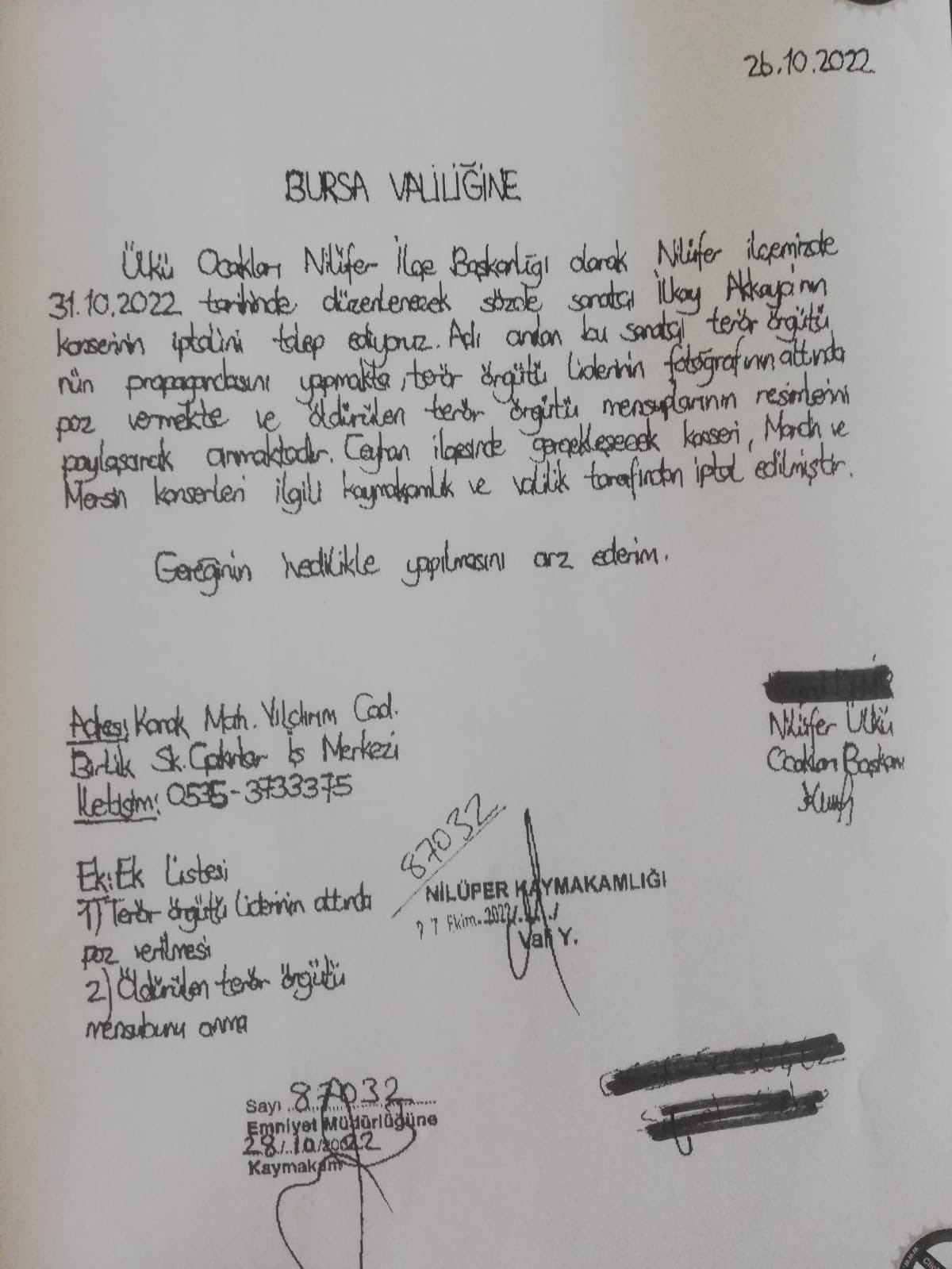 Ülkü Ocaklarının yazdığı dilekçede “Adı anılan bu sanatçı terör örgütünün propagandasını yapmakta, terör örgütü liderinin fotoğrafının altında poz vermekte ve öldürülen terör örgütü mensuplarının resimlerini paylaşarak anmaktadır. Ülkü Ocakları Nilüfer İlçe Başkanlığı olarak Nilüfer ilçemizde 31.10.2022 tarihinde düzenlenecek sözde sanatçı İlkay Akkaya’nın konserinin iptalini talep ediyoruz” ifadeleri kullanıldı.