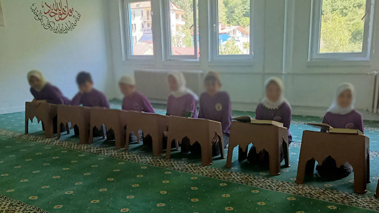 Okul içerisinde bulunan mescitte öğrenciler önlerinde rahle ve Kuran, başlarında başörtü ve takkeyle protokolü karşılamak için hazır bekletildi.