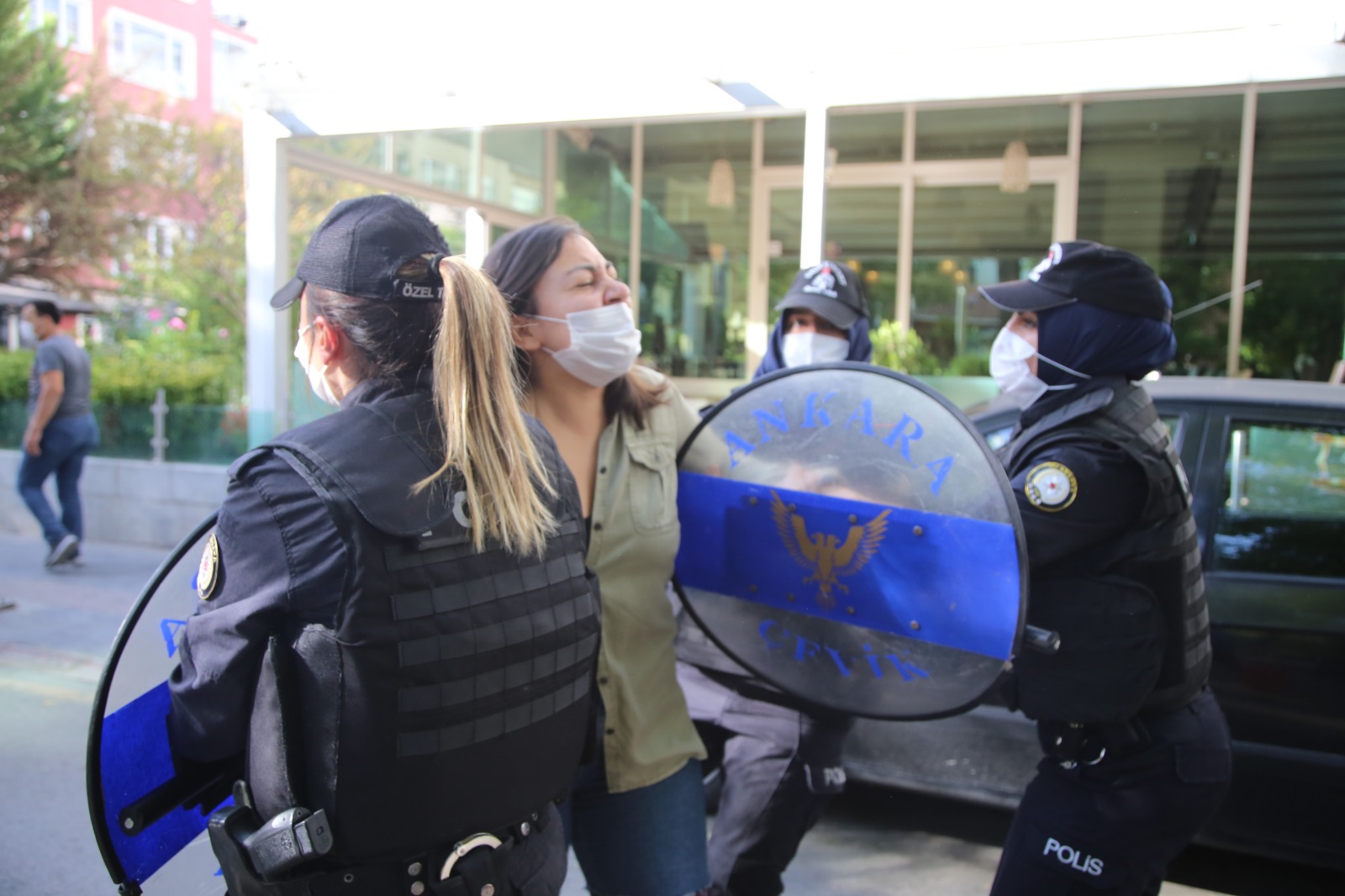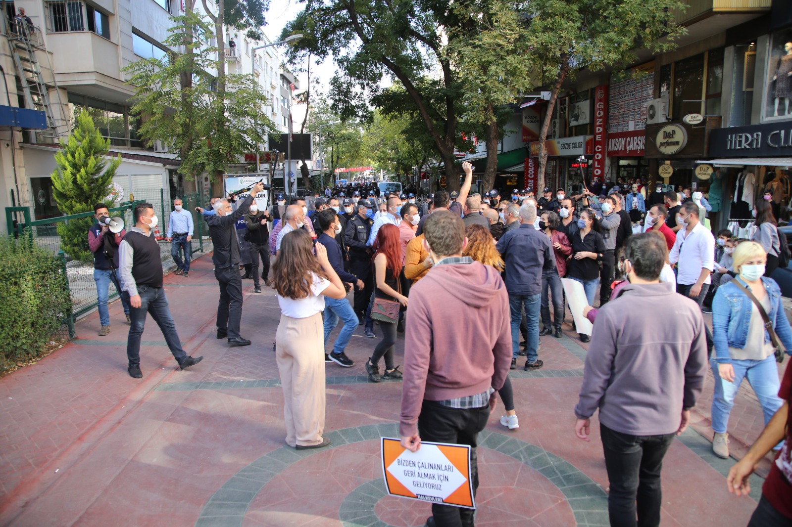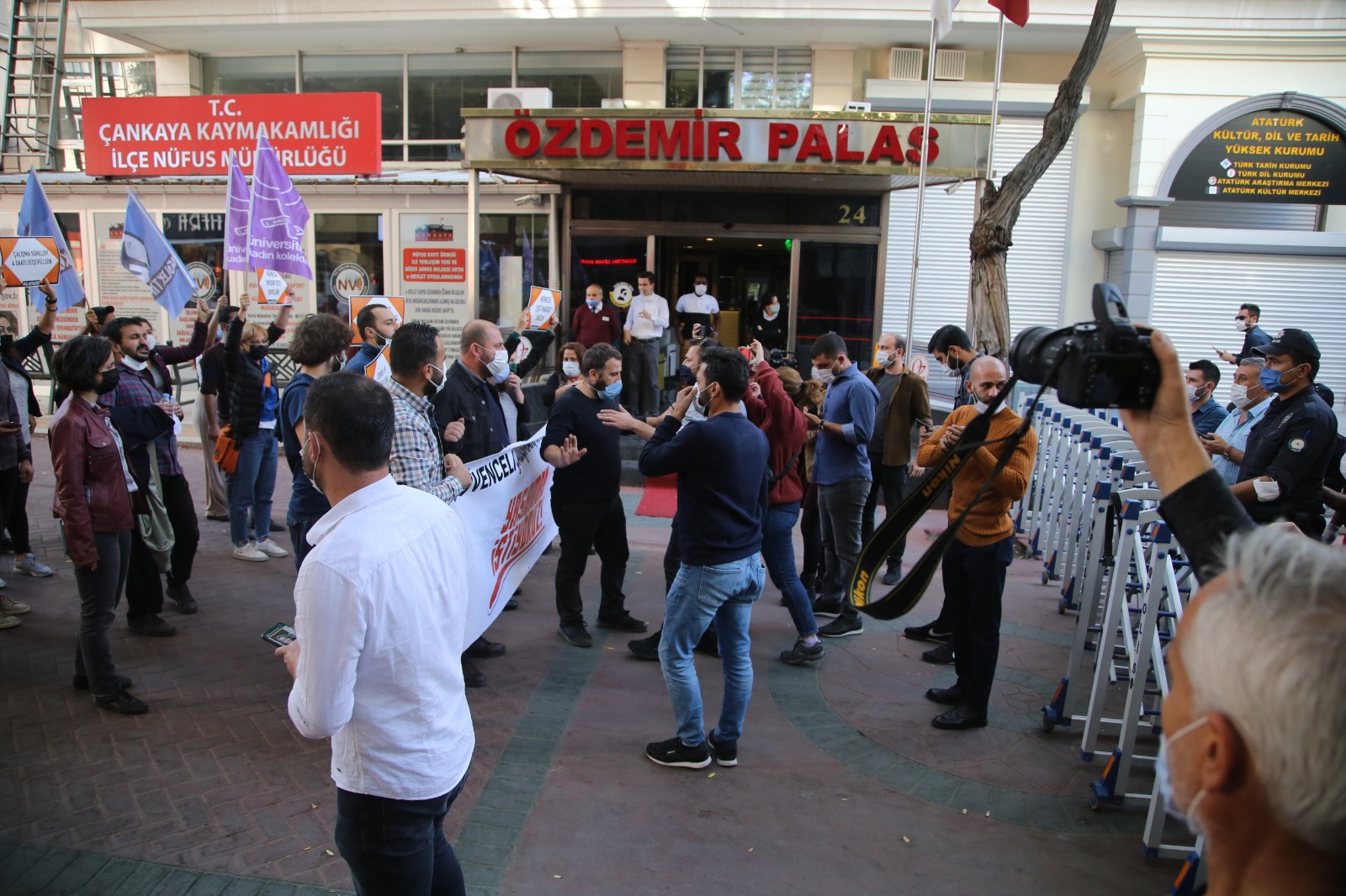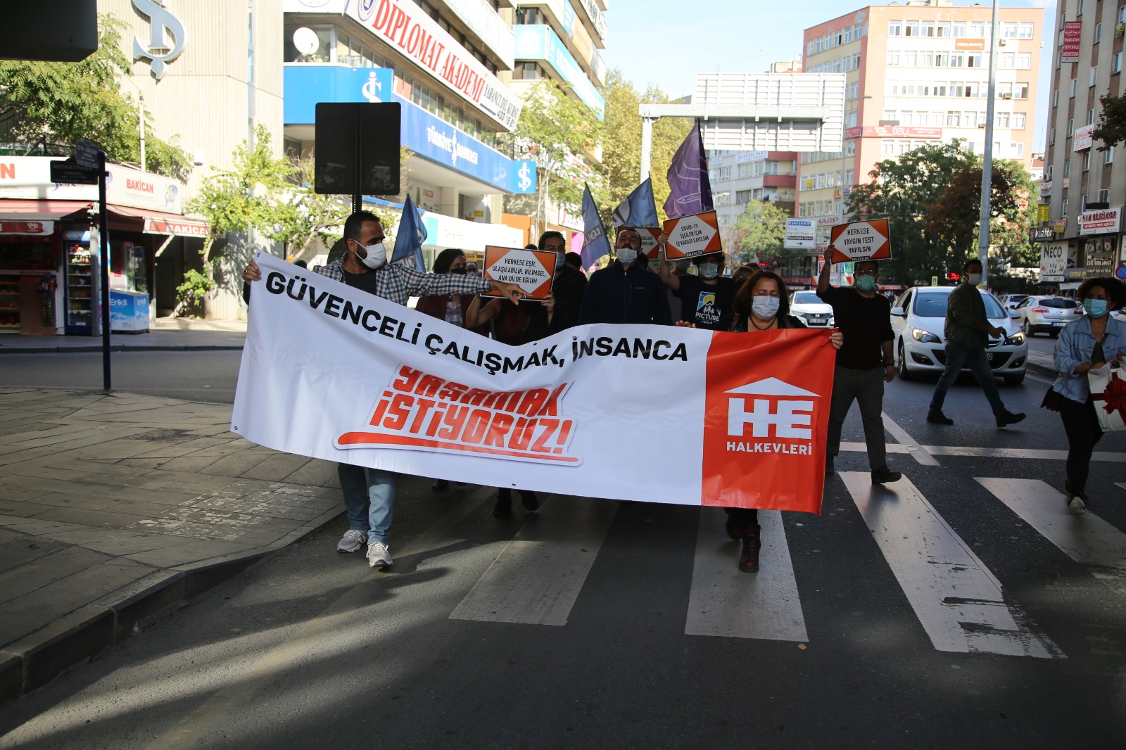 Ziya Gökalp Caddesi üzerinde bulunan İş Bankası önünde bir araya gelen Halkevleri üyeleri, “Güvenceli çalışmak, insanca yaşamak istiyoruz” pankartı açarak yolu trafiğe kapattı. Sakarya Caddesi’ne yürüyen grubun önü polislerce kesildi.