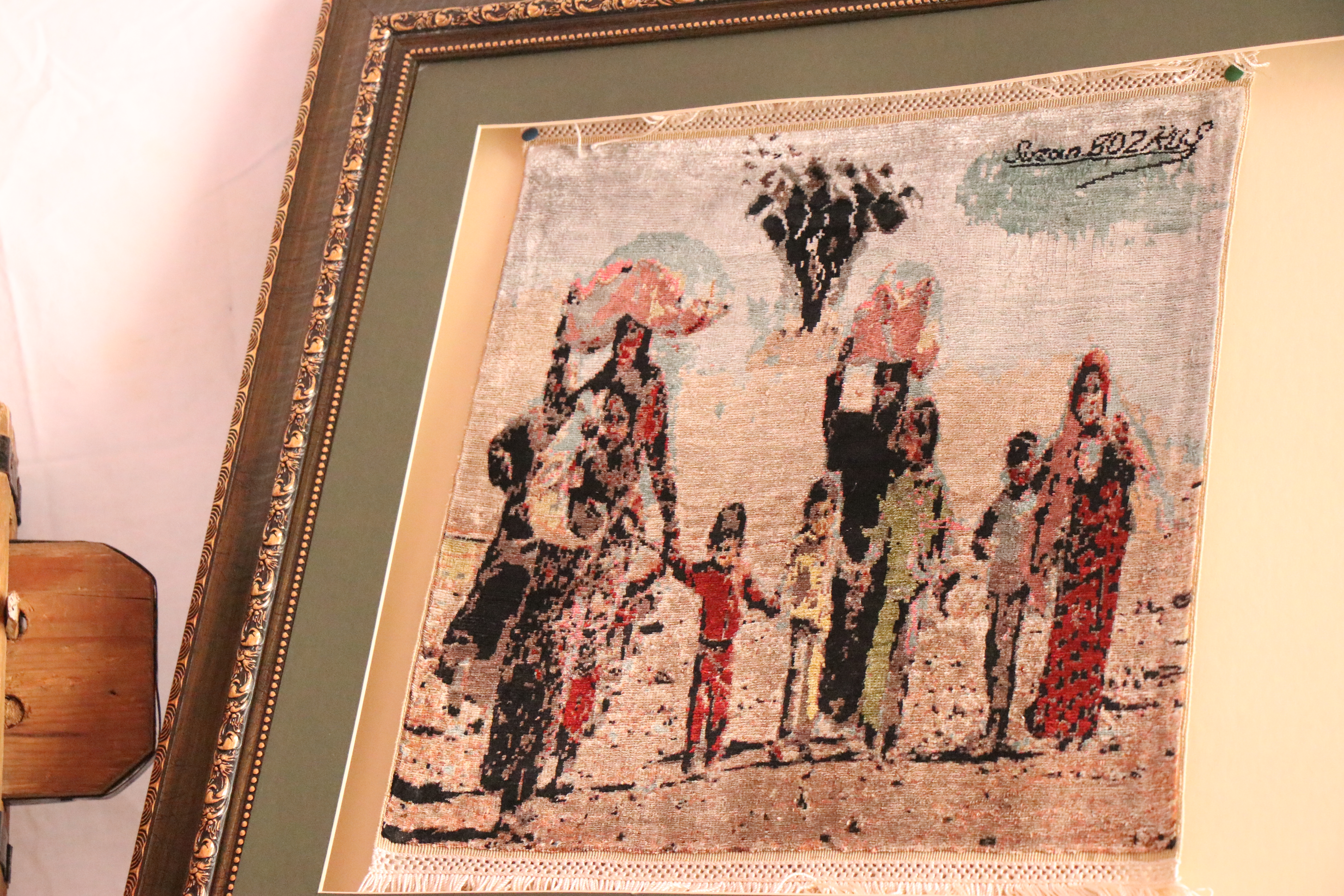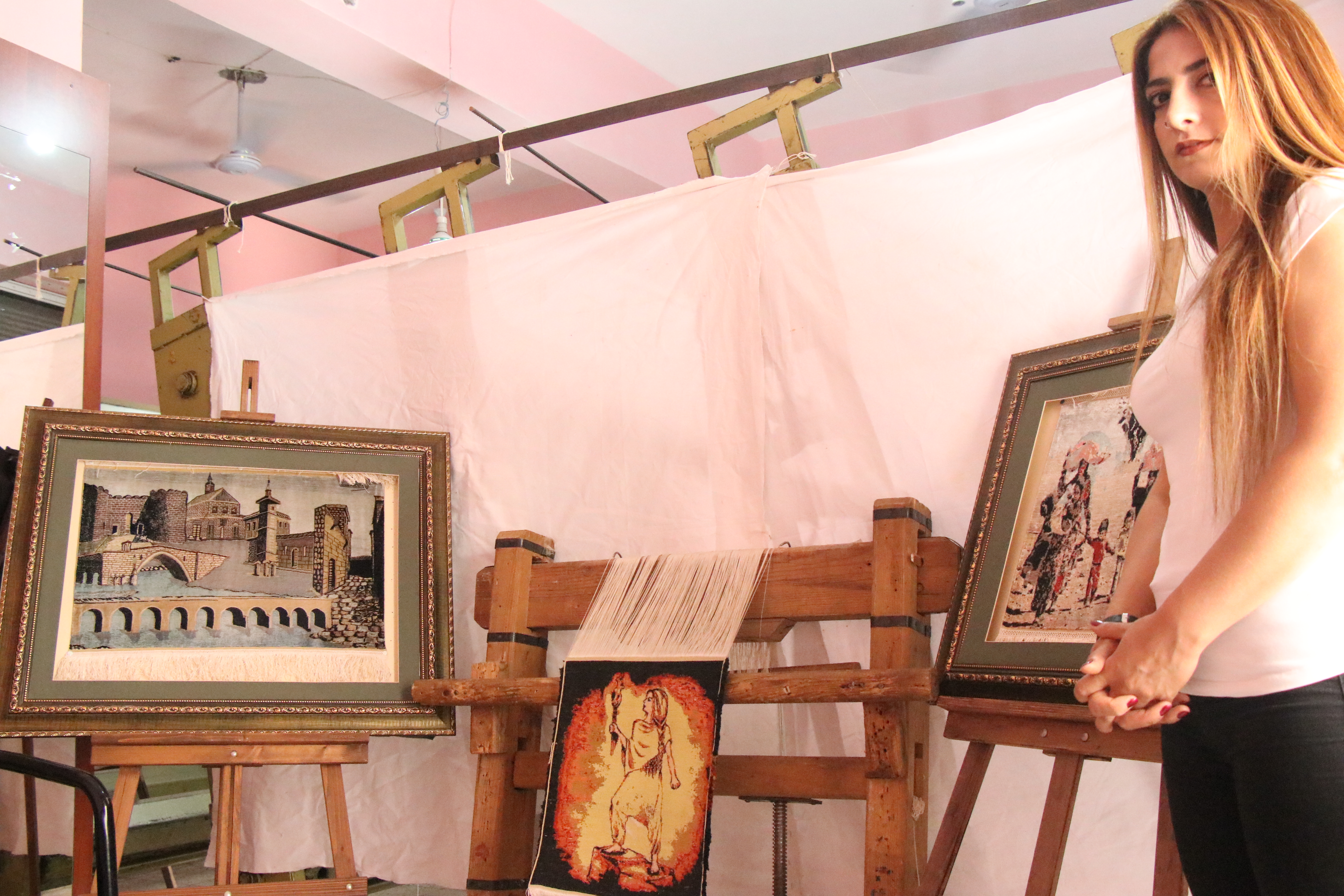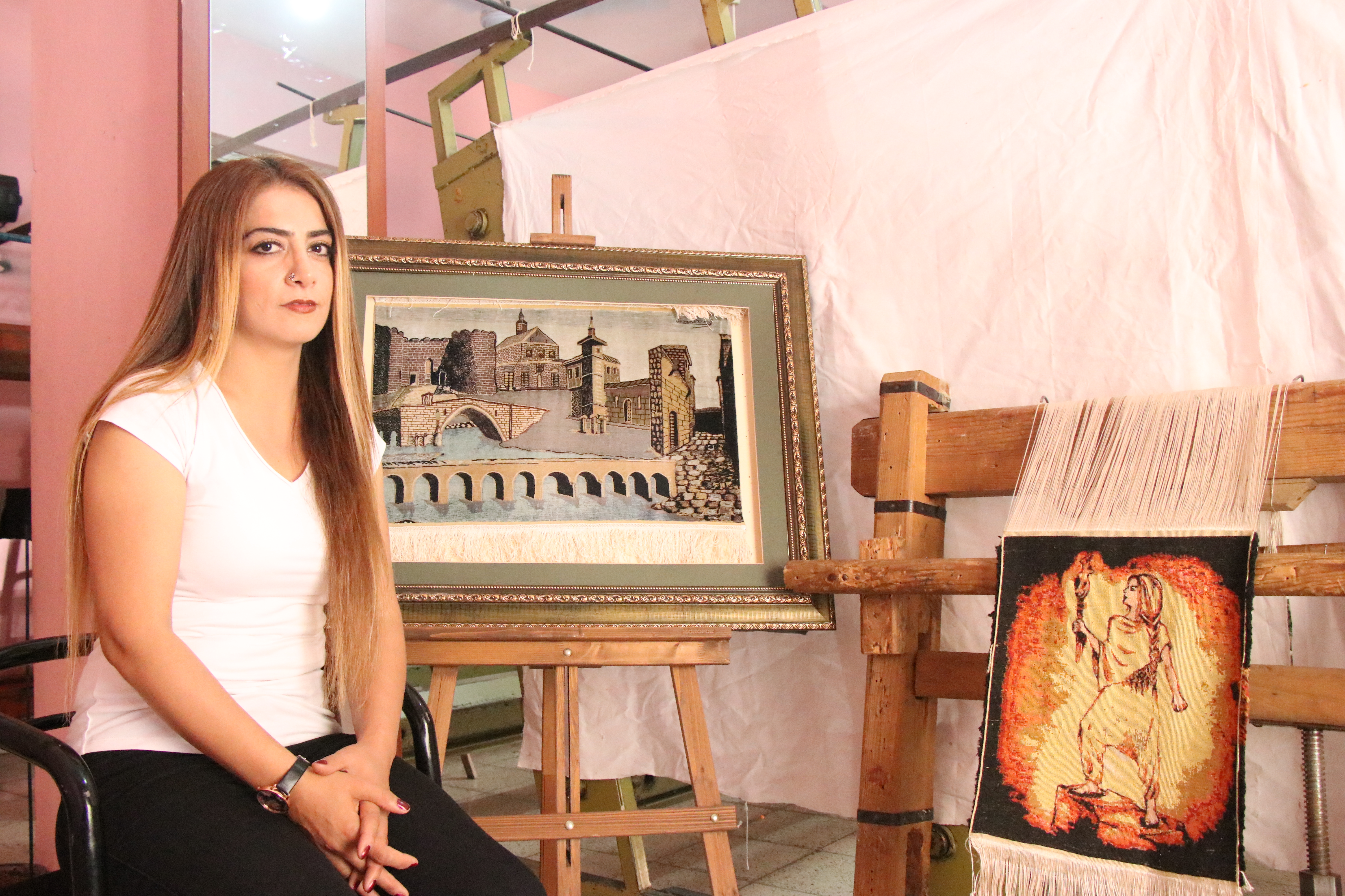 “Daha çok figürler üzerinden gidiyorum. Göç temalı olarak ele aldığım çalışmada savaştan dolayı göç eden kadın ve çocukların perişanlığı dile gelmiş. O dönemde bir fotoğrafçı tarafından çekilmişti bu resim. Oradaki acılar o kadar güzel dile gelmiş, o kadar güzel ayna tutulmuştu ki ben de onu ipek dokumacılığı ile ele alıp ölümsüzleştirmek istedim. Devamında kadın figürü kullanarak ele aldığım çalışmam var. Burada güçlü ve karanlığa ışık tutan bir kadın var. Bilindiği gibi ataerkil bir toplumda yaşıyoruz. Kadın yine birçok zorluk ile karşı karşıya. Burada kadının iradesi ve gücü dile gelmiş. Kadın isterse o zorlukları aşıp en güçlü olabilir düşüncesiyle yola çıktım.”