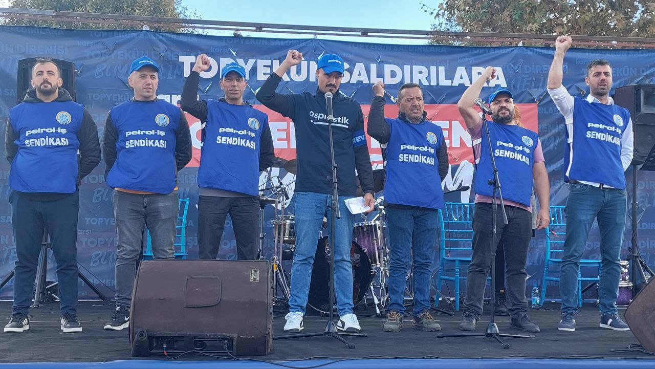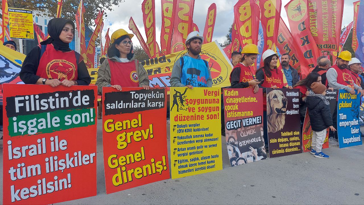“Savaş politikalarından işçi-emekçilere ölüm ve sömürü dışında bir şey çıkmaz diyoruz; daha geçtiğimiz hafta kredi kartı limiti 100 bin üstü olan herkesten 750 lira ‘savunma sanayii’ne haraç kesmeyi tartıştılar. Ne için kullanacaklar bu parayı? Neyi savunacaklar? NATO üyesi, emperyalistlerle işbirliği yapanlar Libya’dan Suriye’ye, Kürdistan’dan Irak’a her yeri kan gölüne çeviren katillerin suç ortağı olan bu ülkenin egemenleri bize hangi vatanın savunmasından bahsediyor? Bu ülkenin yönetenleri, iktidarıyla bütün tezkereleri onaylayan burjuva muhalefetiyle savaşı yaymaya çalışırken, halkların üstüne bombalar yağdırırken biz işçilerin aklında olması gereken şudur ‘onların vatan dedikleri Amerikan üsleri, Amerikan bombası, Amerikan donanması topudur, onların vatan dedikleri çiftlikleri, kasaları ve çek defterleridir, onların vatan dedikleri fabrikalarınızda al kanımızı içmektir.’ Bu savaşlardan zenginleşen yine onlardır, tıpkı bizim her gün ürettiğimiz tüm zenginliğe çöküp bize kırıntılarını vermeleri gibi bu savaşlardan bize düşen de yalnızca ölüm ve sömürü olacaktır. Mesela İsrail Merkezi İstatistik Bürosu resmi verilerine göre 2024 Haziran-Temmuz-Ağustos Türkiye’den İsrail’e toplam ticaret: 227,4 milyon $. Güya ticareti yasaklamışlardı değil mi? İşte size soykırımın destekçileri. Sermaye sınıfı ve bu ülkenin yönetenleri biz işçilerin ürettiği çimentoyla, petrolle, soykırımcı İsrail’i besliyor. Biz işçi sınıfı da direnen Filistin halkının yanında olmak için tıpkı Filistinli sendikacıların çağrısına uyarak bu üretimi durdurmalı, sevkiyatları engellemeliyiz. Savaş politikalarını durduracak tek güç işçilerin birliği, halkların kardeşliği şiarıyla örgütlenmemizi büyütmekten geçiyor.
