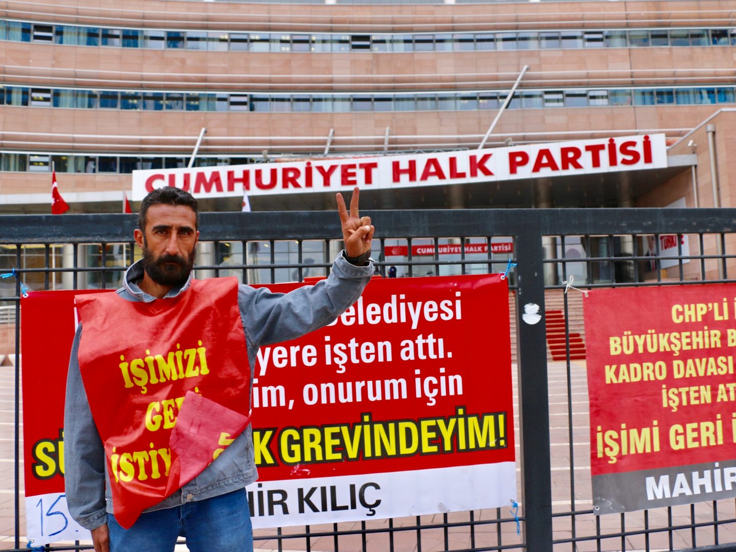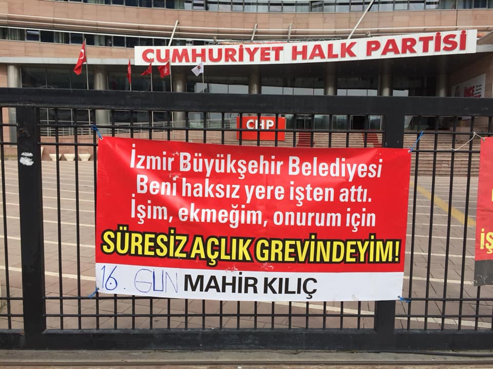 İzmir Büyükşehir Belediyesi’ne kadro davası açıp işten atılan 258 emekçiden biri olan Mahir Kılıç, 184 gün İzmir Büyükşehir Belediyesi önünde açlık grevi yaptı. Daha sonra 24 Haziran seçimleri öncesi Karşıyaka Belediyesi’nde işe başlatılacak diye karşılıklı bir protokol imzalandı. Fakat 14 Mayıs’ta imzalanan protokolden sonra geri dönüş olmadığı ve işe geri alınmadığı için Ankara Cumhuriyet Halk Partisi (CHP) Genel Merkez önünde oturma eylemi gerçekleştirdi. Oturma eyleminin 49. günü süresiz açlık grevinin ise 16. gününde olan Kılıç, PİRHA’ya değerlendirmelerde bulundu.