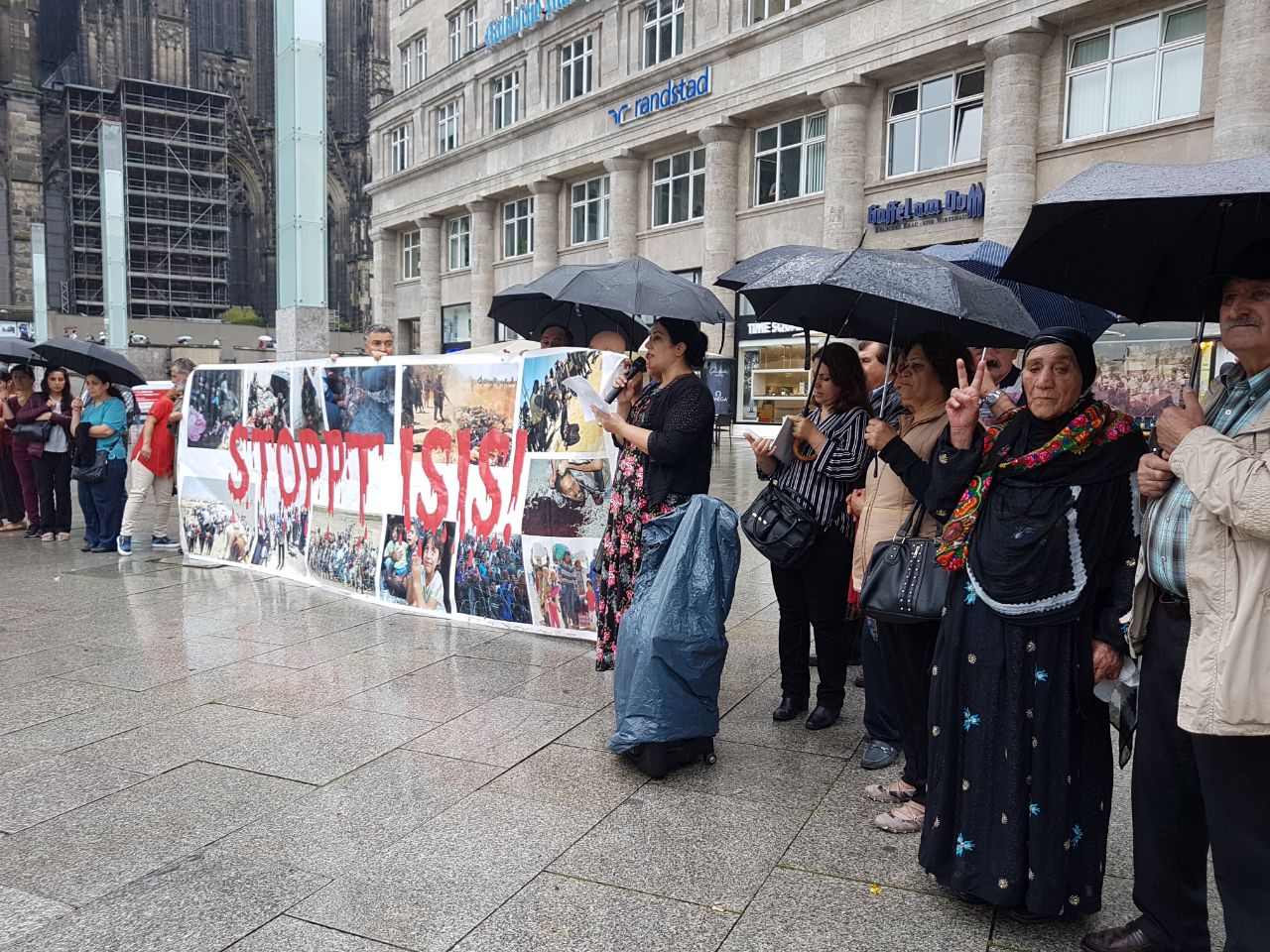 Köln kentinde Merkezi Tren Garı önünde yapılan açıklamada “Bu barbarca saldırı büyük bir yıkım ve nüfus hareketi ile neticelendi. Bu dönem, Êzidîlerin katliamlar ve fermanlarla yazılmış tarihinde yeni bir kara sayfa, 73. Ferman olarak yer aldı“ denildi.