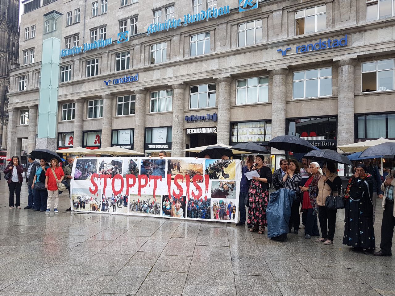 Köln kentinde Merkezi Tren Garı önünde yapılan açıklamada “Bu barbarca saldırı büyük bir yıkım ve nüfus hareketi ile neticelendi. Bu dönem, Êzidîlerin katliamlar ve fermanlarla yazılmış tarihinde yeni bir kara sayfa, 73. Ferman olarak yer aldı“ denildi.