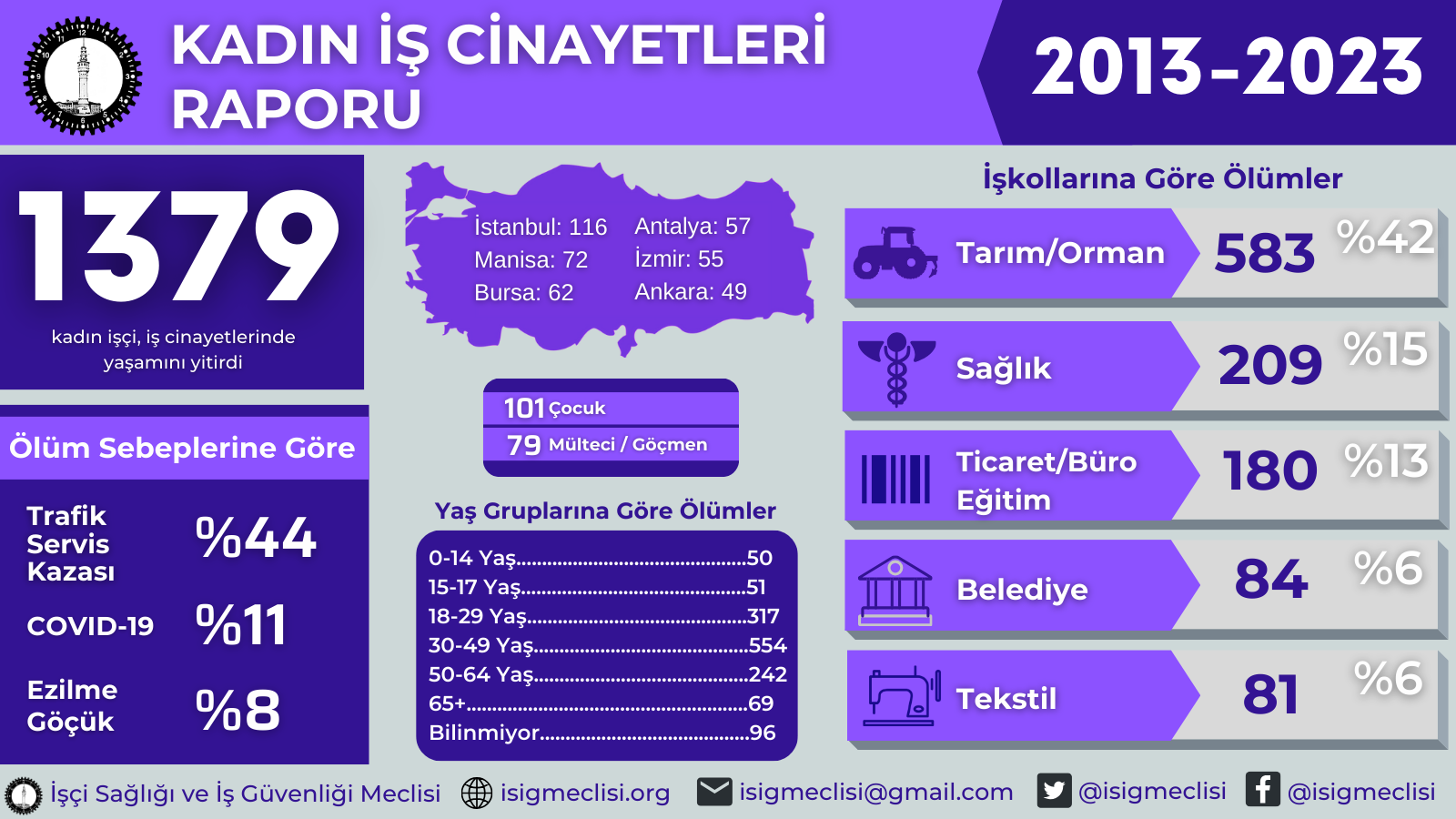 İSİG Meclisi, 2013-2023 ( ilk on ay) yılları arasında en az 1379 kadın işçinin hayatını kaybettiği bilgisine de vurgu yaptı. Kadınların yaşadıkları iş cinayetleri, meslek hastalıkları ve iş kazalarının görünmediğimi belirten İSİG Meclisi, şu açıklamayı yaptı: