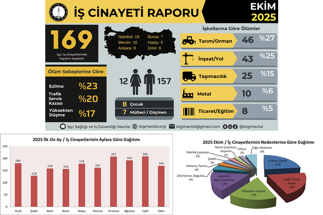 PİRHA – İşçi Sağlığı ve İş Güvenliği (İSİG) Meclisi, Ekim 2025’e dair iş cinayetleri raporunu yayımladı. Rapora göre, yalnızca bir ay içinde 169 işçi hayatını kaybetti. Bu ölümlerden 46’sı tarım ve orman, 43’ü inşaat ve yol, 25’i taşımacılık sektörlerinde meydana geldi. Raporda, ölüm nedenlerinin başında yüzde 23 ile ezilme, yüzde 20 ile trafik/servis kazaları ve yüzde 17 ile yüksekten düşme geldiği belirtiliyor.