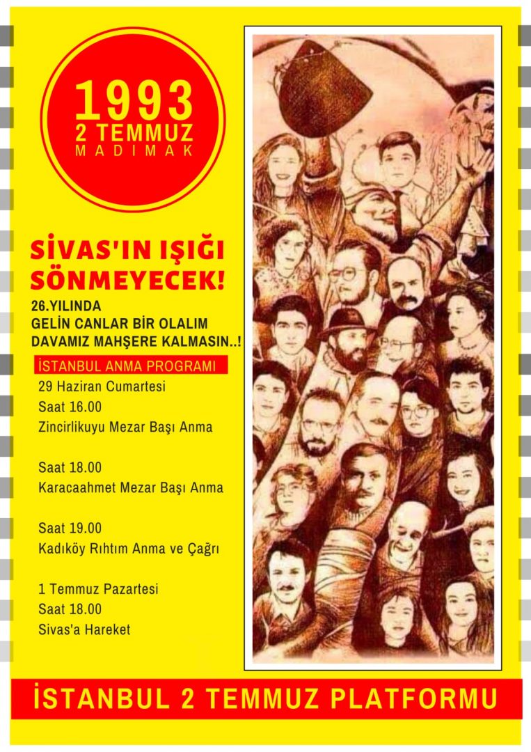 2 Temmuz 2993 yılında Pir Sultan Abdal’ı Anma etkinlikleri sırasında Sivas’ta kaldıkları Madımak Oteli’nde gericiler tarafından yakılarak katledilen 33 can anılacak.