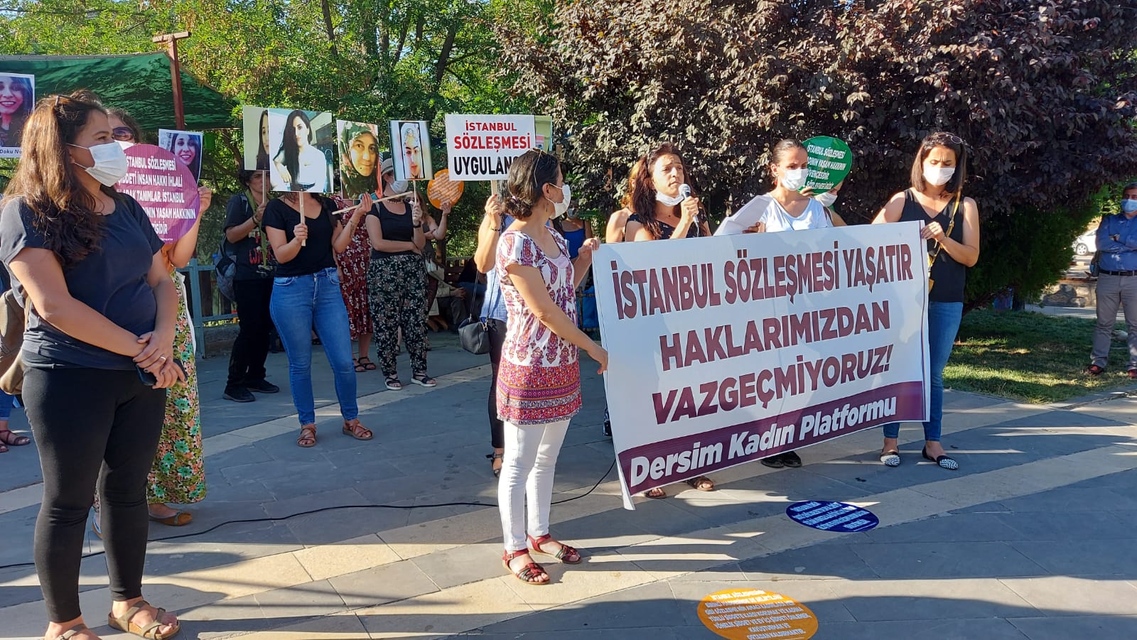 Açıklamada kadınlar, “İstanbul sözleşmesi yaşatır, haklarımızdan vazgeçmiyoruz” pankartlarını açıp, katledilen kadınların fotoğraflarını taşıyarak “Kadın yaşam özgürlük” sloganlarını attı.