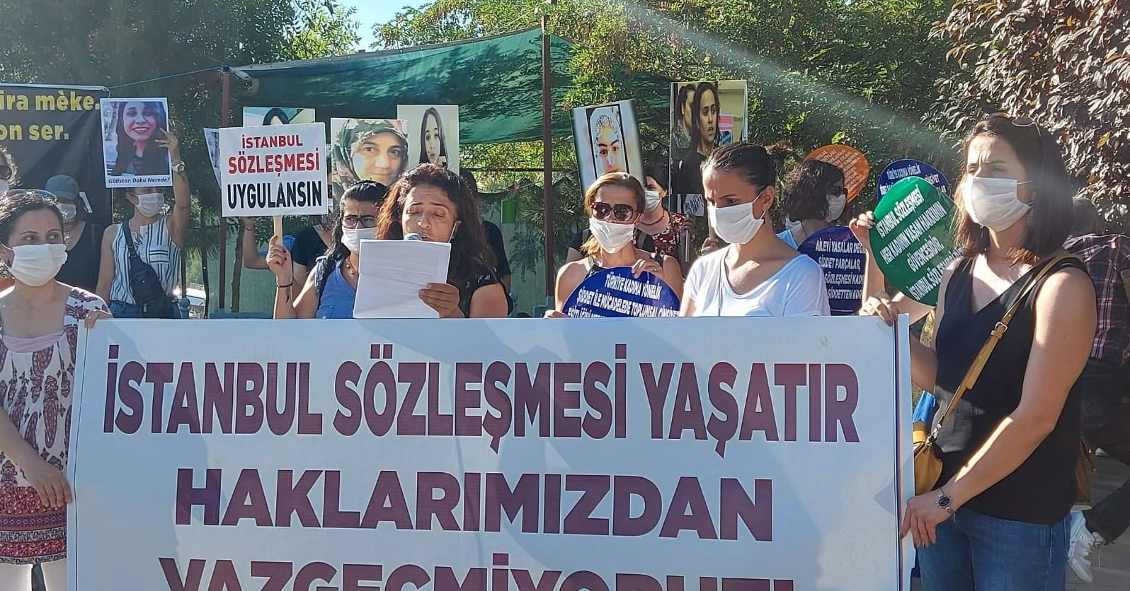 Erkek şiddetiyle katledilen kadınların isimlerinin saymakla bitmediğini belirten Yeşil, “Sadece Temmuz ayında 36 kadın öldürüldü. Katledilen Şule Çet, Nadira Kadirova, Ceren Damar cinayetlerinde olduğu gibi daha adil bir yargılama yapılmadı” dedi. Yeşil, Gülistan Doku’nun 216 gündür bulunamadığını, kadınların hukuk önünde en önemli dayanağı olan İstanbul Sözleşmesi’ne göz dikildiğini vurguladı.