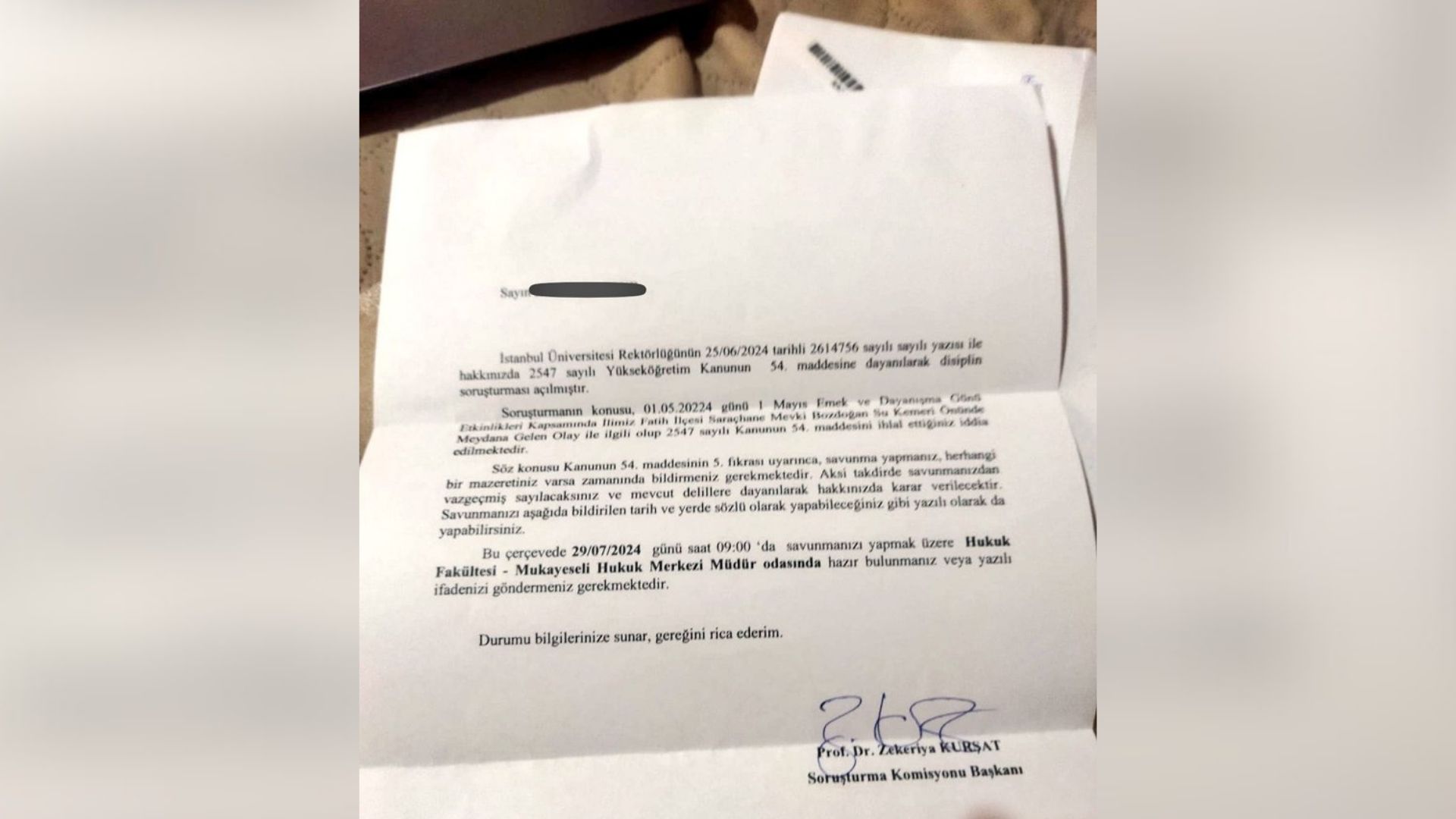 Açılan soruşturma şu ifadelere yer verildi: “Soruşturmanın konusu, 01.05.20224 günü 1 Mayıs Emek ve Dayanışma Gönü Etkinlikleri Kapsamında ilimiz Fatih İlçesi Saraçhane Mevki Bozdoğan Su Kemeri Önünde Meydana Gelen Olay ile ilgili olup 2547 sayılı Kanunun 54. maddesini ihlal ettiğiniz iddia edilmektedir. Söz konusu Kanunun 54. maddesinin 5. fıkrası uyarınca, savunma yapmanız, herhangi bir mazeretiniz varsa zamanında bildirmeniz gerekmektedir. Aksi takdirde savunmanızdan vazgeçmiş sayılacaksınız ve mevcut delillere dayanılarak hakkınızda karar verilecektir.”