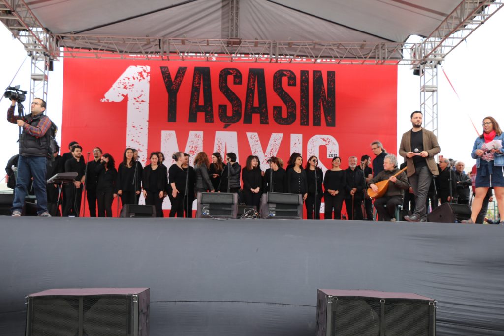 Emek örgütleri temsilcileri, sivil toplum kuruluşları başkanları, siyasi parti temsilcileri sahnede halkı selamlayarak, ardından DİSK korosuyla birlikte Enternasyonal marşını seslendirdiler.