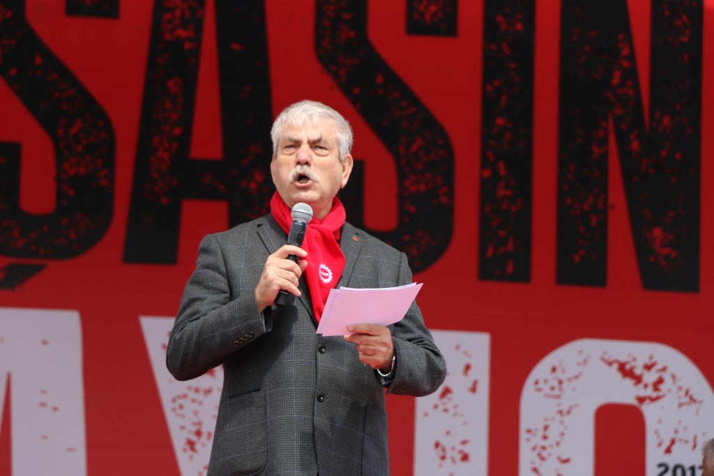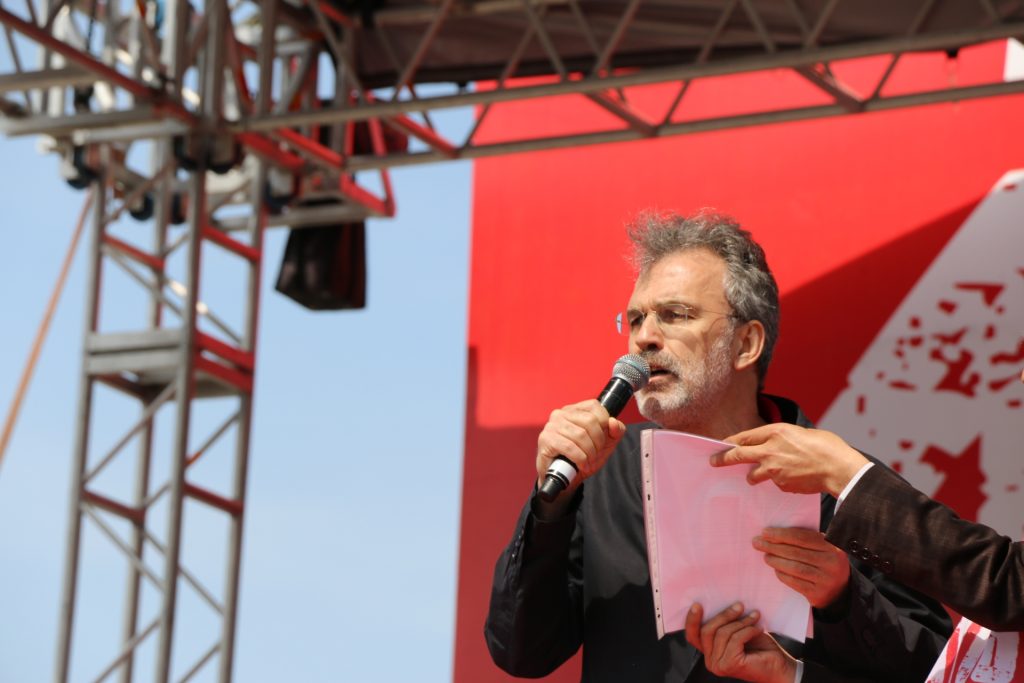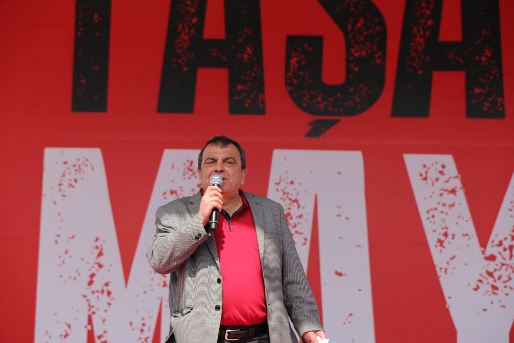 KESK Eş Genel Başkanı Lami Özgen de, 1977 1 Mayıs’ında katledilen işçilerin, Ankara’da yaşamını yitirenlerin ve daha bir çok katliamda yaşamını yitirenlerin önünde saygıyla eğildiğini söyledi. Referanduma değinen Özgen “16 Nisan’da bu ülkenin emekçileri, işçileri demokrasi güçleri kendi hayır taleplerini ifade ettiler. Referandum sürecinde hayır taleplerimizi ortaklaştırarak, bu ülkenin yarısı olduğunu ortaya koyduk. KHK’lara, OHAL’e, baskıya, gözaltılara, iş güvencesinin ortadan kaldırılmasına, iş cinayetlerine hayır. Onlar her zaman ki gibi hileleriyle bizlerin iradesini çaldı. Referandum sonuçları şaibelidir. Bu ülkenin yarısı olarak kabul etmediğimizi ve bir kere daha hayır demeye devam ediyoruz” dedi.