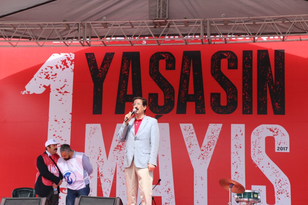 KHK’larla yaşanan ihraçları hatırlatan Tükel “Düşük ücret, ağır çalışma şartları ve taşeronlaşma dayatılıyor. Kıdem tazminatının fona devredilmesi için gün sayılıyor. Kölelik düzeni getirilmek isteniyor. Haklarımızı gasp eden anlayıştan kurtulmak için hayır demeyi sürdürüyoruz. Bilimsel ve toplumsal sağlık anlayışını, sağlıkta şiddetin sona ermesi için, akademik değerlerine karşı özgür, demokratik üniversite için, karanlık değil aydınlığın egemen olması için tüm baskıcı uygulamalara karşı durmak, laik demokratik bir ülke için hayır demeyi sürdürüyoruz. Yaşasın 1 Mayıs” şeklinde ifade etti.