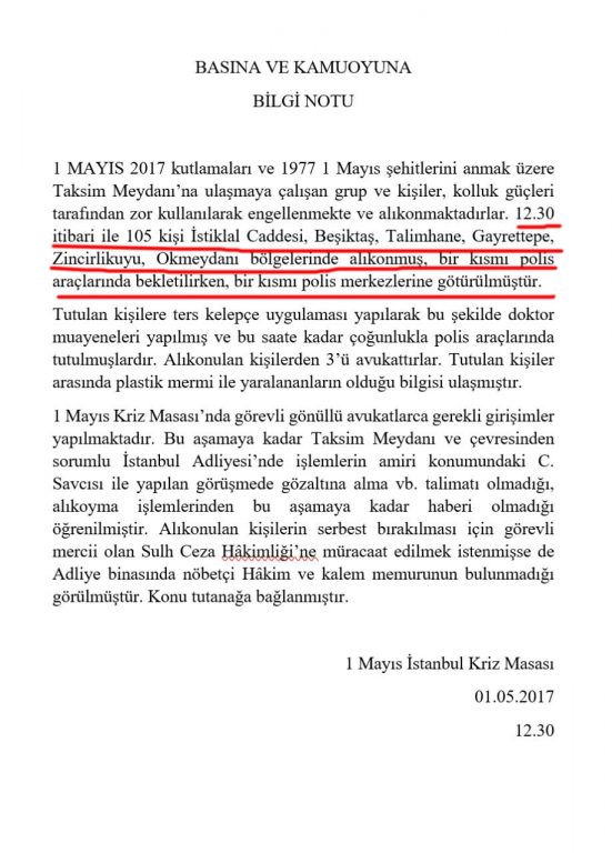 Saat 12.30 itibariyle İstiklal Caddesi, Talimhane, Beşiktaş, Gayrettepe, Zincirlikuyu, Okmeydanı’nda 105 kişinin alıkonulduğu belirtilen açıklamada, gözaltıların bir kısmının polis merkezlerine götürüldüğü bir kısmının da araçlarda bekletildiği ifade edildi.