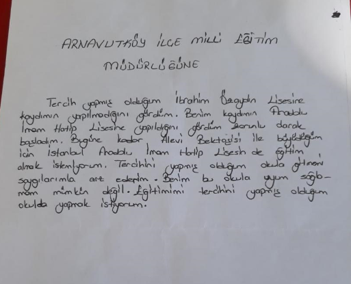 A.A’nın velisi Musa A., Arnavutköy İlçe Milli Eğitim Müdürlüğü’ne dilekçe yazarak çocuğunun kaydının tercih yaptığı okula alınmasını istedi. Dilekçede A.A’nın bugüne kadar Alevi Bektaşi öğretisiyle yetiştirildiği, bu yüzden imam hatip lisesinde eğitim görmek istemediği vurgulandı.