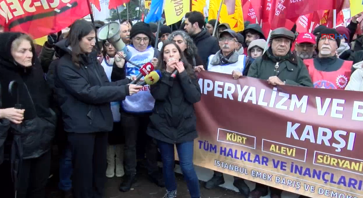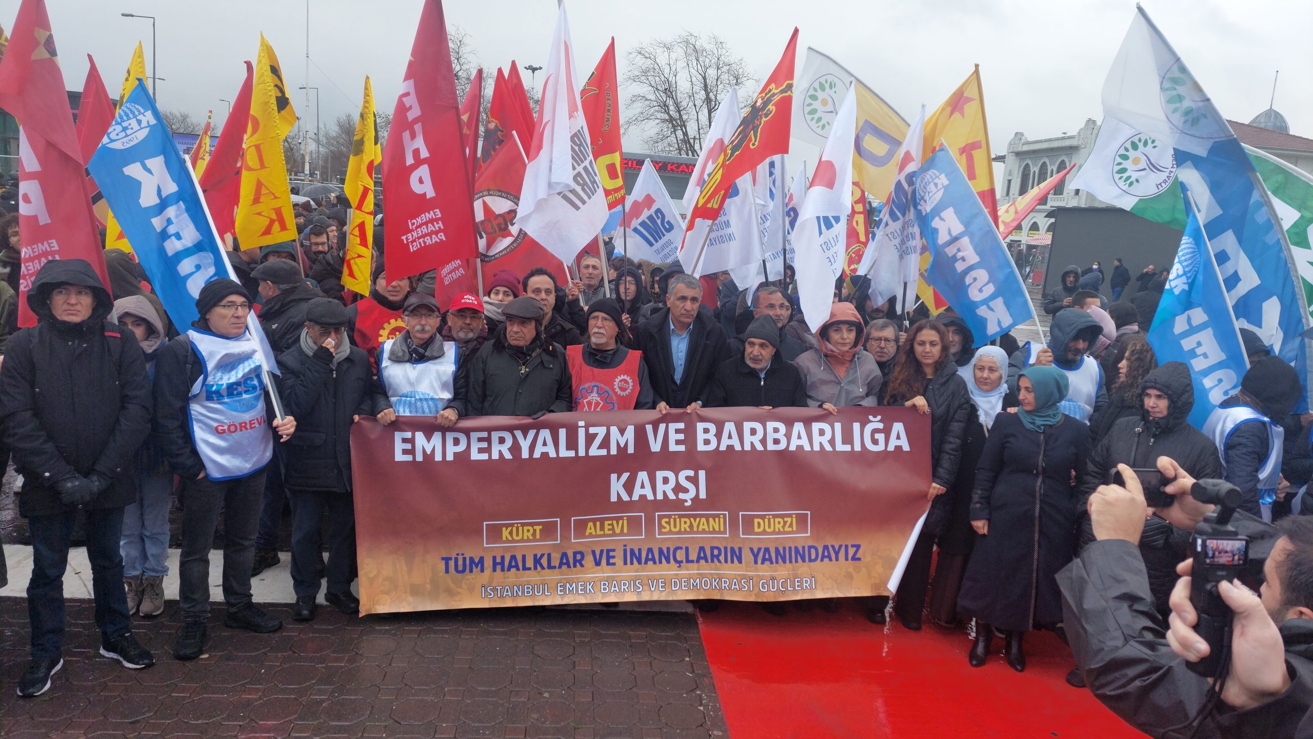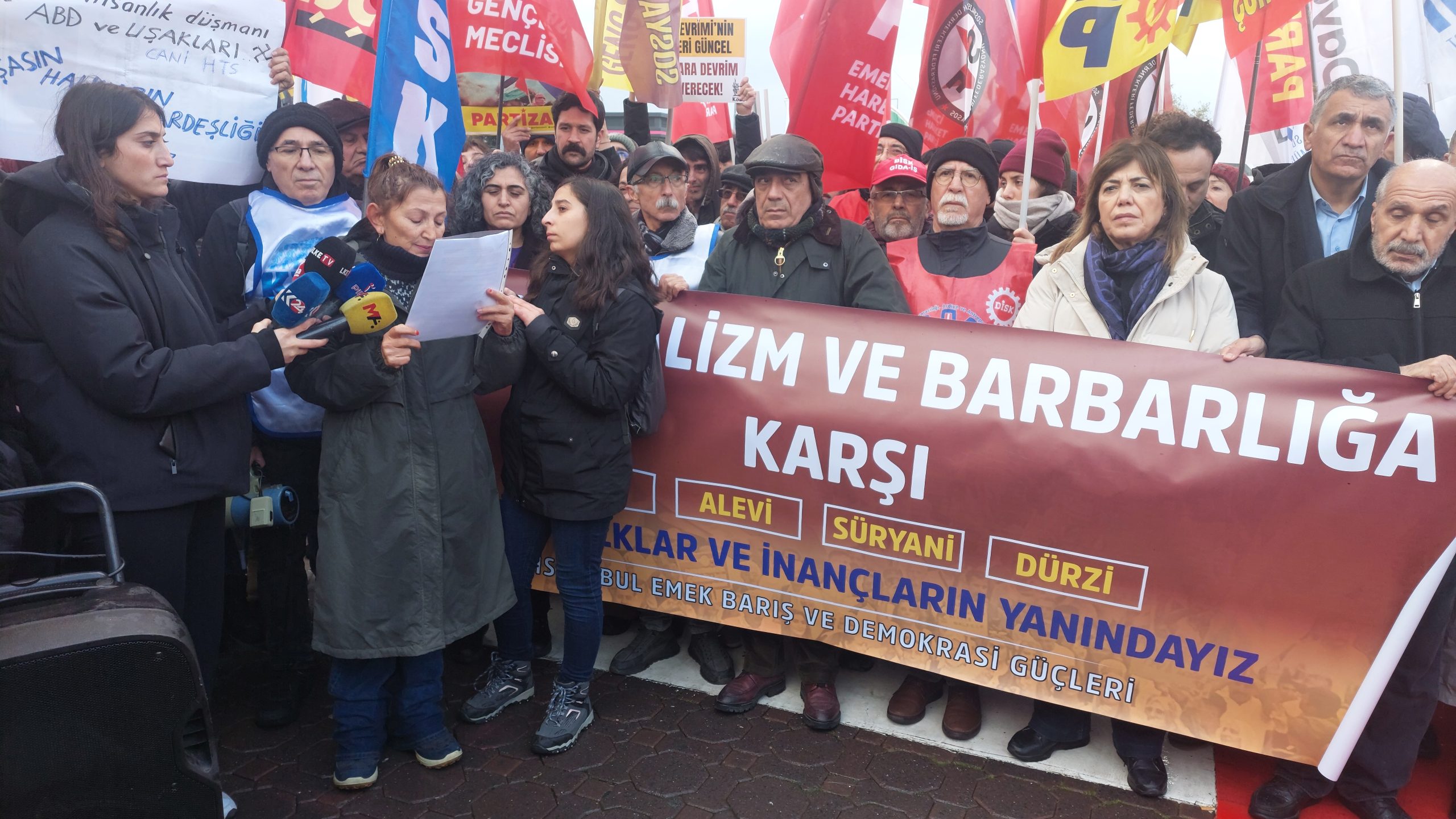 Bizler İstanbul Emek, Barış ve Demokrasi Güçleri olarak; Suriye’de katledilen Alevilerin, direnen Dürzilerin, bombalanan Kürtlerin ve yok sayılan tüm inançların yanındayız.”