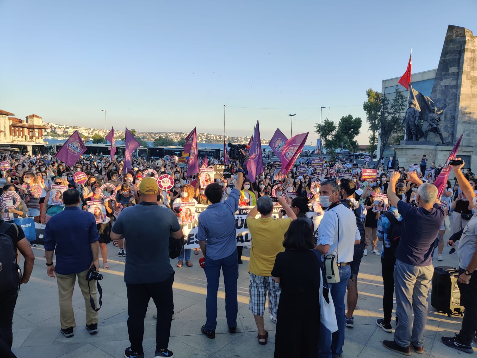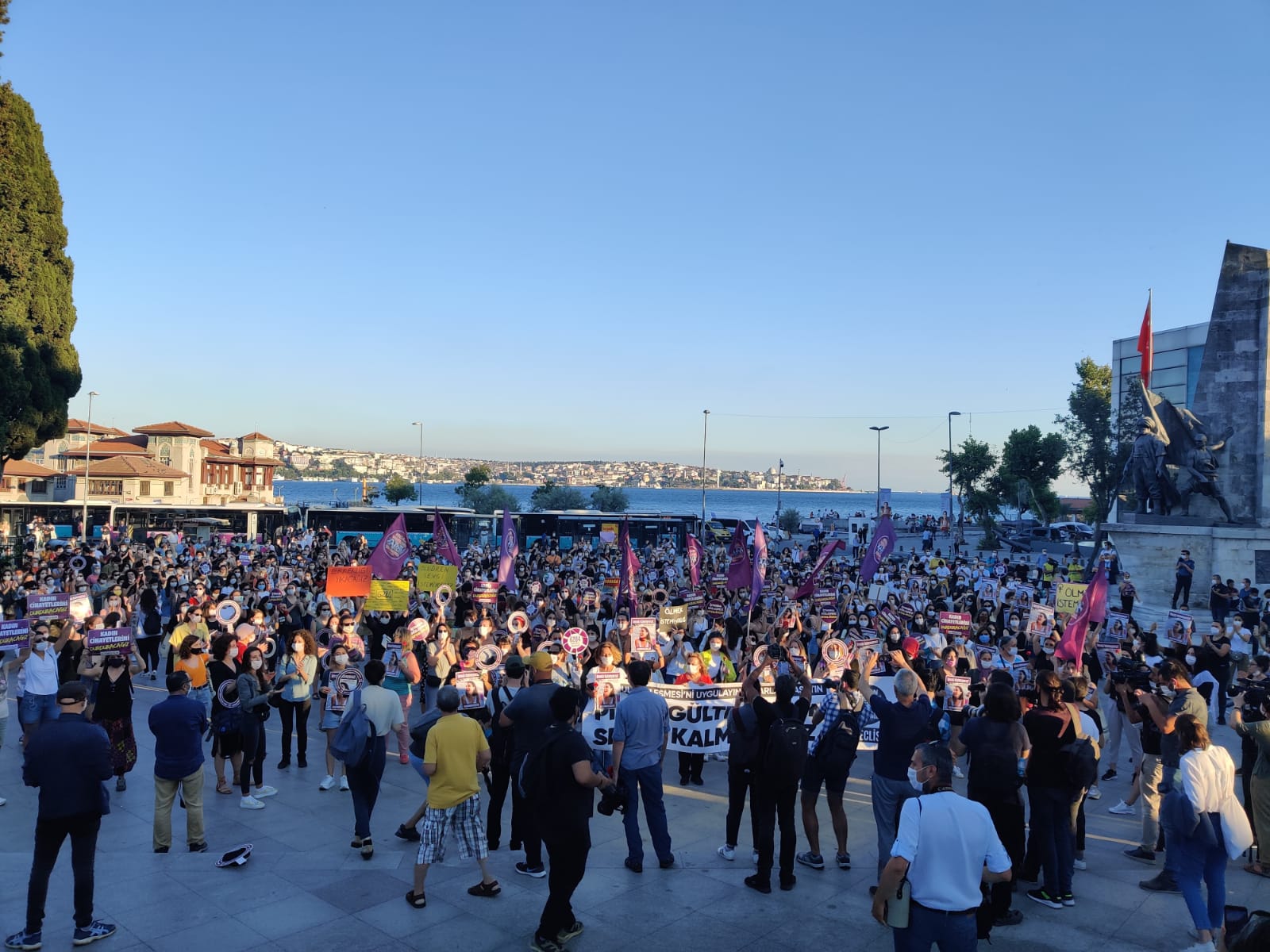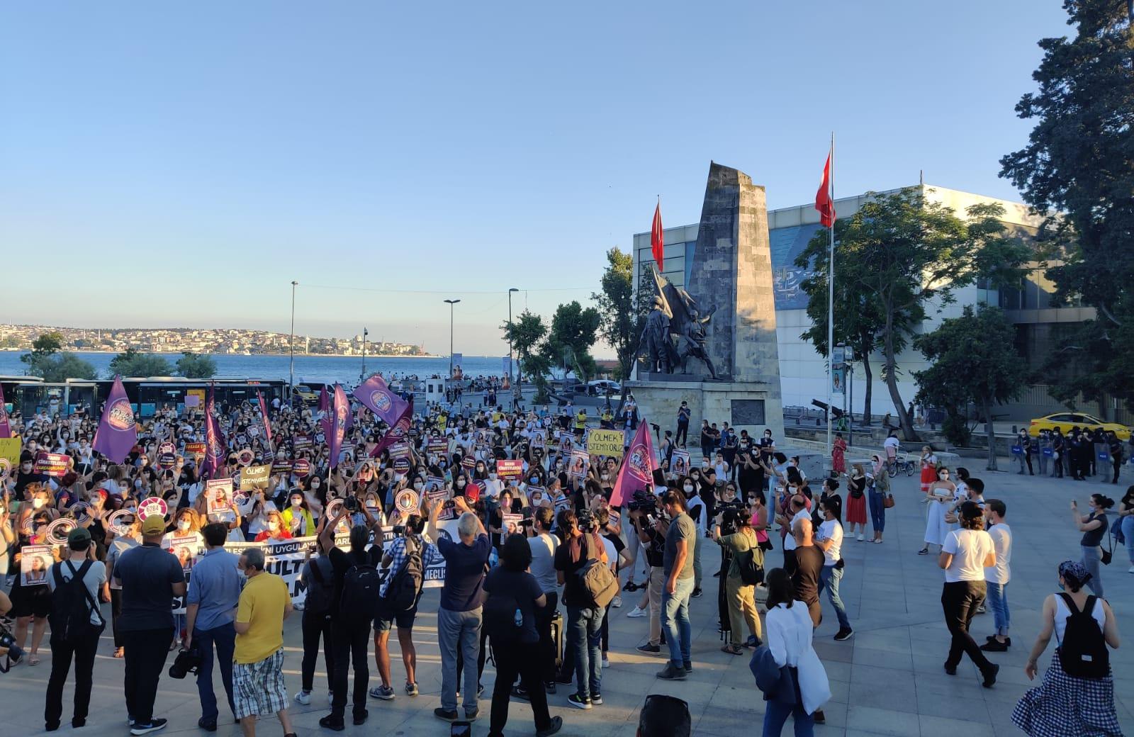 İstanbul Beşiktaş’ta bir araya gelen kadınlar, “Kadın yaşam özgürlük”, “Asla yalnız yürümeyeceksin” sloganlarıyla erkek şiddetini protesto etti. İstanbul Sözleşmesi’nin bir an önce uygulamaya konulması çağrısında bulunan kadınlar, meydanlardan kazanarak gitmek istediklerini belirterek “Milyonlarca kadının öfkesiyle bu meydanlardayız. Her kadına diyoruz ki ‘asla yalnız yürümeyeceksin.’ İstanbul Sözleşmesi kadınlar için yaşamdır. Bunlar ne diyorlar? ‘Gelenek’ diyorlar. Geleneğe bakar mısınız!” açıklamasını yaptı.