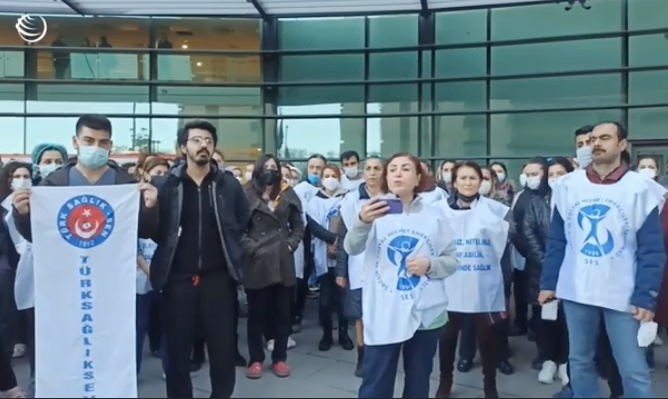 Okmeydanı Cemil Taşçıoğlu Şehir Hastanesinde çalışan sağlık emekçileri sadece hekimlere yönelik yapılan düzenlemeyi protesto etti. Sağlık ve Sosyal Hizmet Emekçileri Sendikası (SES) ve Türk Sağlık-Sen (TSS) üyesi emekçiler sefalete mahkum olmayacağız diyerek ortak açıklama yaptı. Zam talebiyle bir araya gelen işçiler adına açıklamayı SES Şişli Şube EşBaşkanı Fadime Kavak okudu.