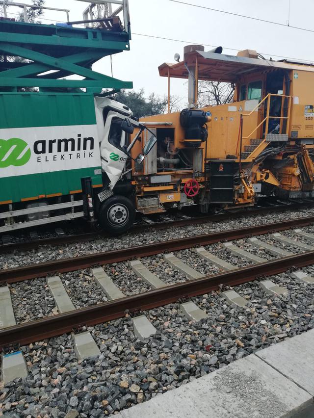 İstanbul Florya’da Halkalı-Gebze banliyö tren hattında deneme sürüşü yapan demir yolu aracı ile elektrik hattını döşeyen araç çarpıştı.