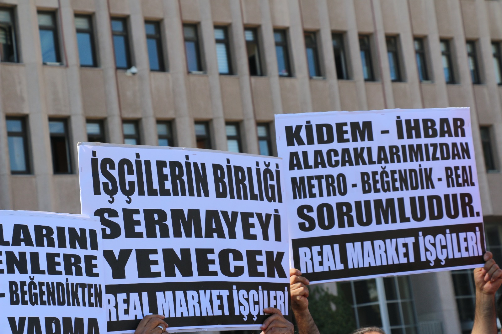 2014 yılında kıdem, ihbar, izin ve fazla mesaisi ödenmeyerek işten çıkarılan Real Market işçileri suç duyurusunda bulunmak için Ankara Adliyesi önünde basın açıklaması yaparak haklarını aradılar. Yaşadıklarını PİRHA‘ya anlatan işten çıkarılanlardan biri olan Beğendik Mağazası çalışanlarından Tekbile Yükrük, “2017 yılının 15 Ağustos günü bir gün içerisinde Beğendik kurumu tarafından kapı dışarı edildik” dedi. 10 yıldır emek veren bir kişi olduğunu belirten Yükrük, “Yaklaşık 19 yıldır emek veren arkadaşlarımız var. Ve bizlerin kıdem ihbar tazminatları hukuki izinlerimiz ödenmeden bayram öncesinde kapı dışarı edildik” diye belirtti.