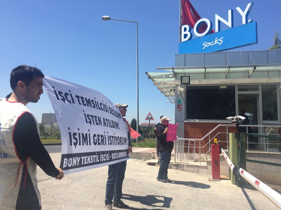 PİRHA-Bony Tekstilin Çerkezköy fabrikasından işten çıkarılan BATİS üyesi Hakan Gürses fabrika önünde direniş başlattı. “İşçi temsilcisi seçildim isten atıldım. İşimi geri istiyorum” pankartı açan Gürses “Kazanana kadar direnişi sürdüreceğim” dedi.