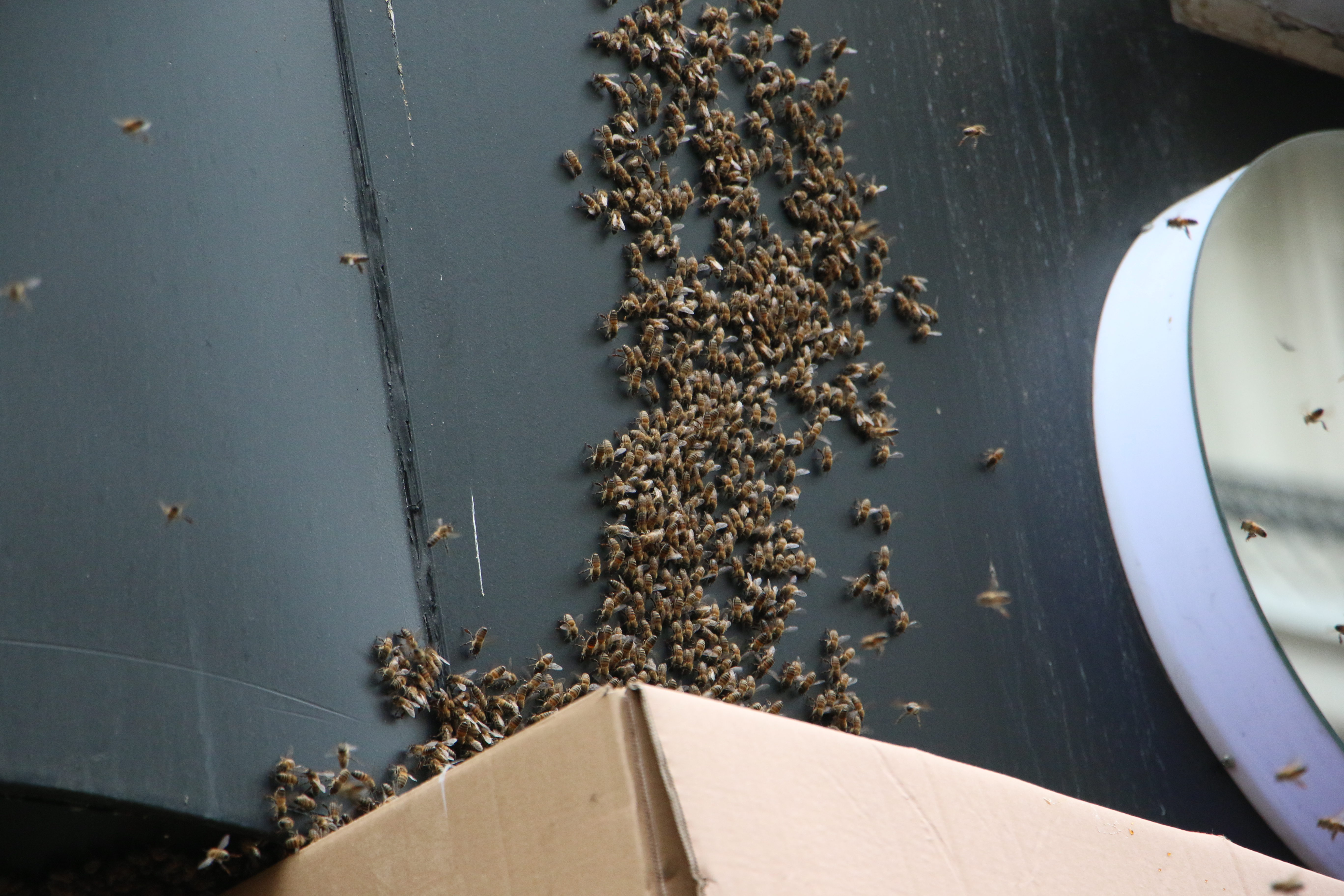 Taksim’de bir giysi mağazasının tabelasına konan bal arılarını restoranda çalışan bir aşçı maske giyinmeden çıplak elle yoğun uğraşlar sonrası elindeki kartona koydu.
