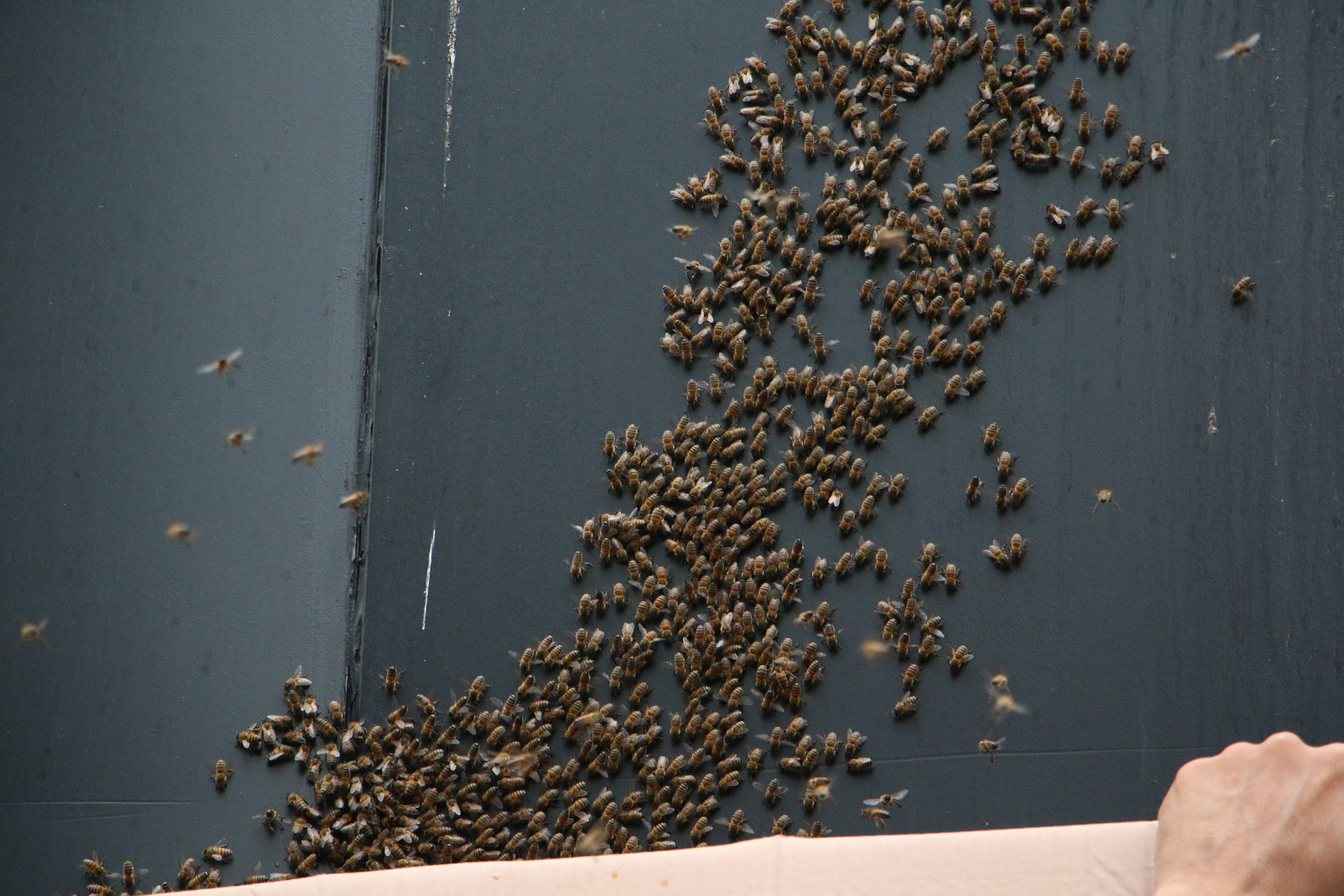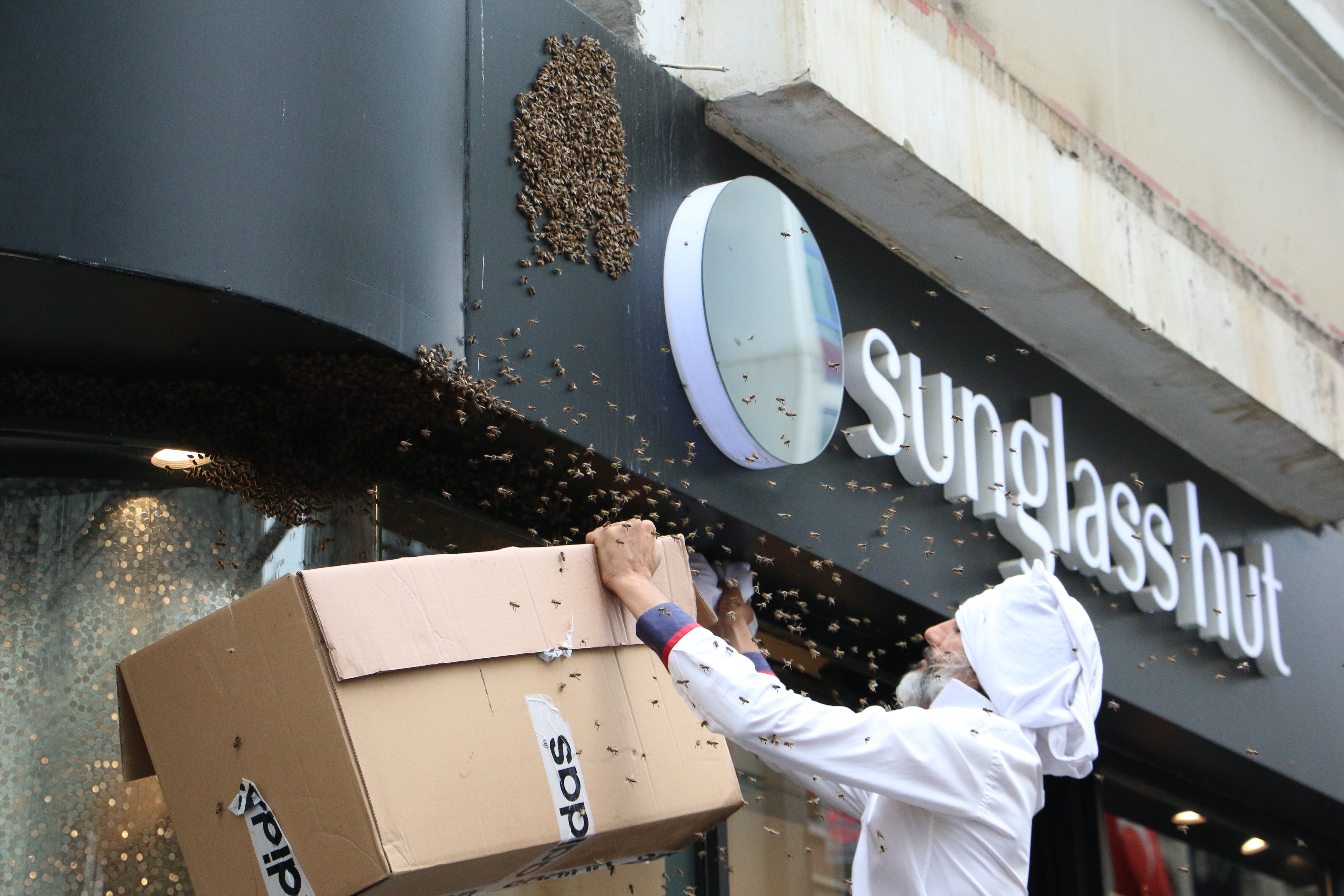 Taksim’de bir giysi mağazasının tabelasına konan bal arılarını restoranda çalışan bir aşçı maske giyinmeden çıplak elle yoğun uğraşlar sonrası elindeki kartona koydu.