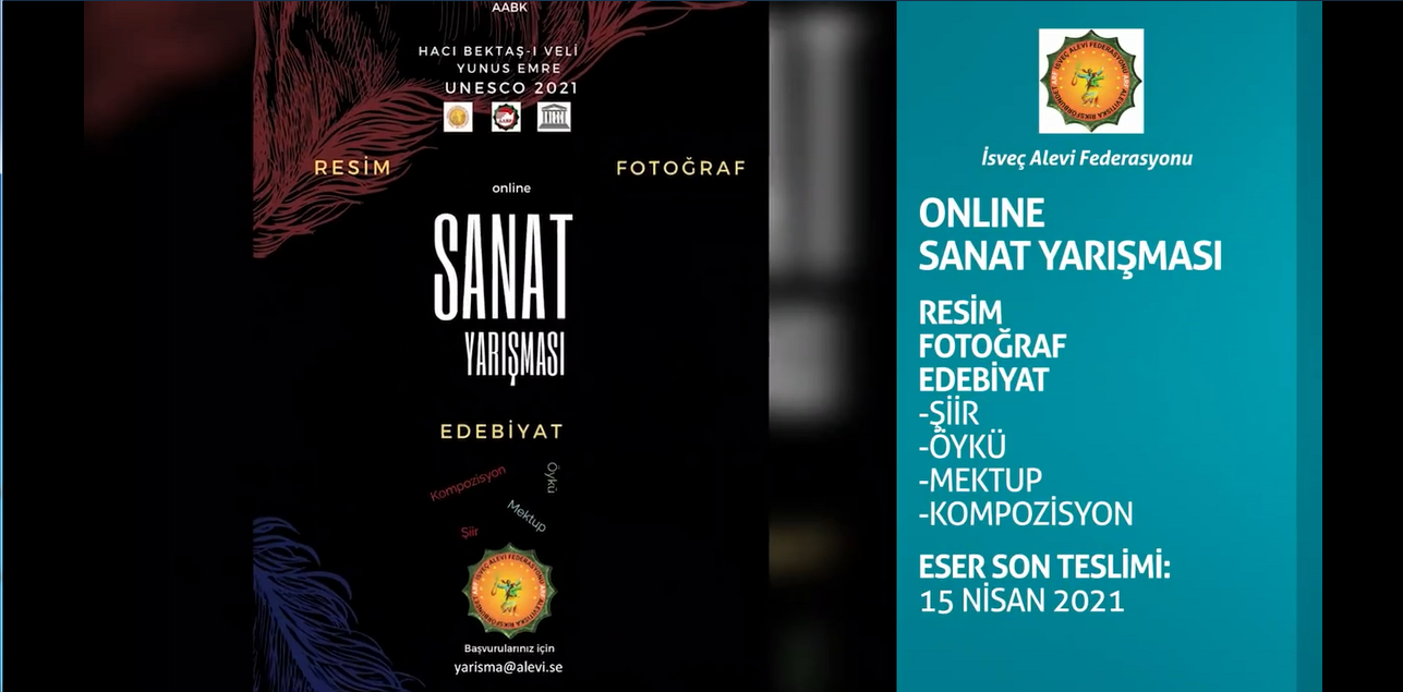 İsveç Alevi Federasyonu, UNESCO 2021 Hacı Bektaş-ı Veli ve Yunus Emre Yılı çalışmaları kapsamında, Sanat Yarışması başlattı. Yarışmaya edebiyat (Kompozisyon, şiir, öykü, mektup), resim ve fotoğraf alanlarındaki eserlerle başvuru yapılabilecek. Sanat yarışmasına, 15 Nisan 2021 tarihine kadar başvuru yapılabilecek.