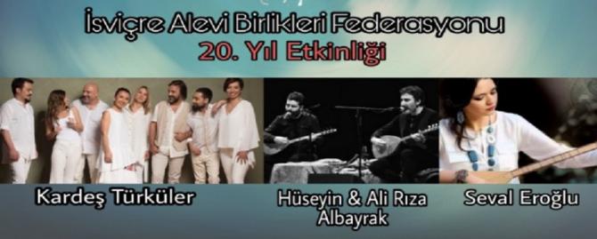 İsviçre Alevi Birlikleri Federasyonun 20. yılına ilişkin düzenlenecek olan etkinlikte Kominist Başkan olarak bilinen Fatih Mehmet Maçoğlu, AABK Onursal Başkanı Turgut Öker, Britanya Alevi Federasyon Başkanı İsrafil Erbil, Avrupa AAKB Başkanı Nevin Kamilağaoğlu, AAGB Başkanı Ümit Sarı, AABK Genel Sekreteri Bülent Ant ve İABF Başkanı Cem Bitnel’in katılımı ile bir panel gerçekleşecek. Etkinlikte bünyesinde gerçekleşecek konserde ise Kardeş Türküler, Sanatçı Hüseyin ve Ali Rıza Albayrak, Sanatçı Seval Eroğlu sahne alacak.