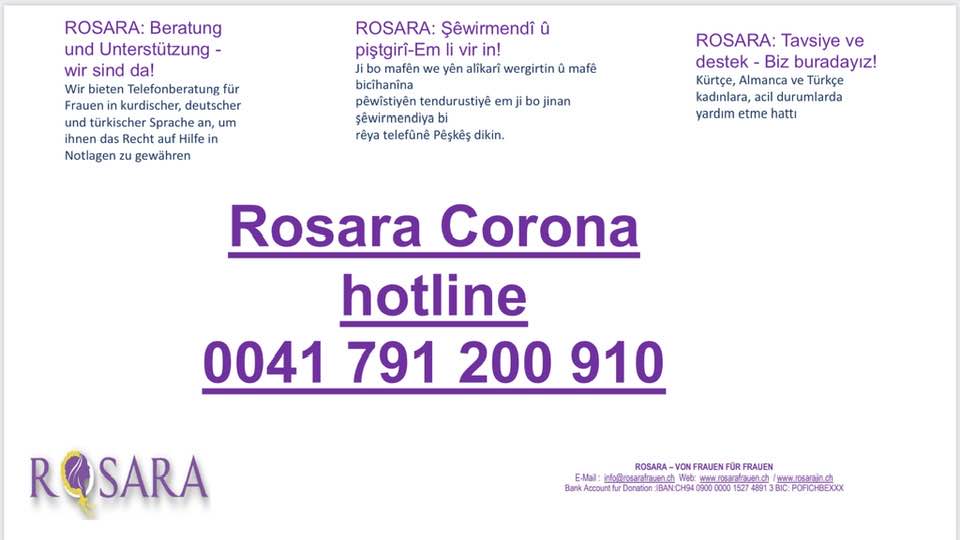 Rosara Kadın Merkezi ve İsviçre Alevi Birlikleri Federasyonu yayınladıkları basın açıklamalarıyla bu süreçte ihtiyacı olan herkesin hotline numaraları üzerinden kendilerine başvurabileceğini belirttiler.