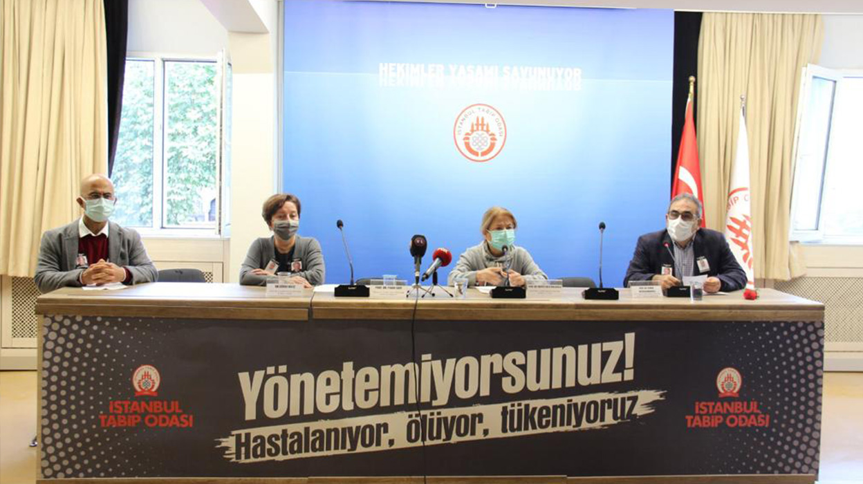 “Bugün hem geçtiğimiz günlerde Covid-19 sebebiyle kaybettiğimiz iki meslektaşımız için saygı duruşunda bulunmak, hem de Türkiye’de ve İstanbul’da kontrolden çıkan pandemiyle ilgili uyarı ve tespitlerimizi, acilen atılması gereken adımları paylaşmak için toplandık. Pandemi adeta “kırana” dönmüş durumda. Öncelikle söylemek gerekir ki bu salgının kesin bir tedavisi henüz yok. Şu an yapabileceğimiz hastalığın yayılmasını önlemektir. Bunun için de bilime güvenerek hareket etmek gerekiyor. Geçtiğimiz ay, Ekim raporunu açıklarken dile getirmiştik; hasta sayısı kontrolden çıkmış şekilde artıyor.