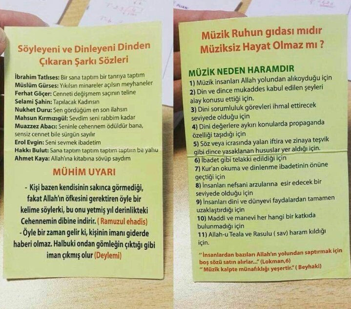 Söz konusu bildiride ‘Söyleyeni ve dinleyeni dinden çıkaran şarkı sözleri’, ‘Müzik neden haramdır’ gibi başlıklar bulunuyor.