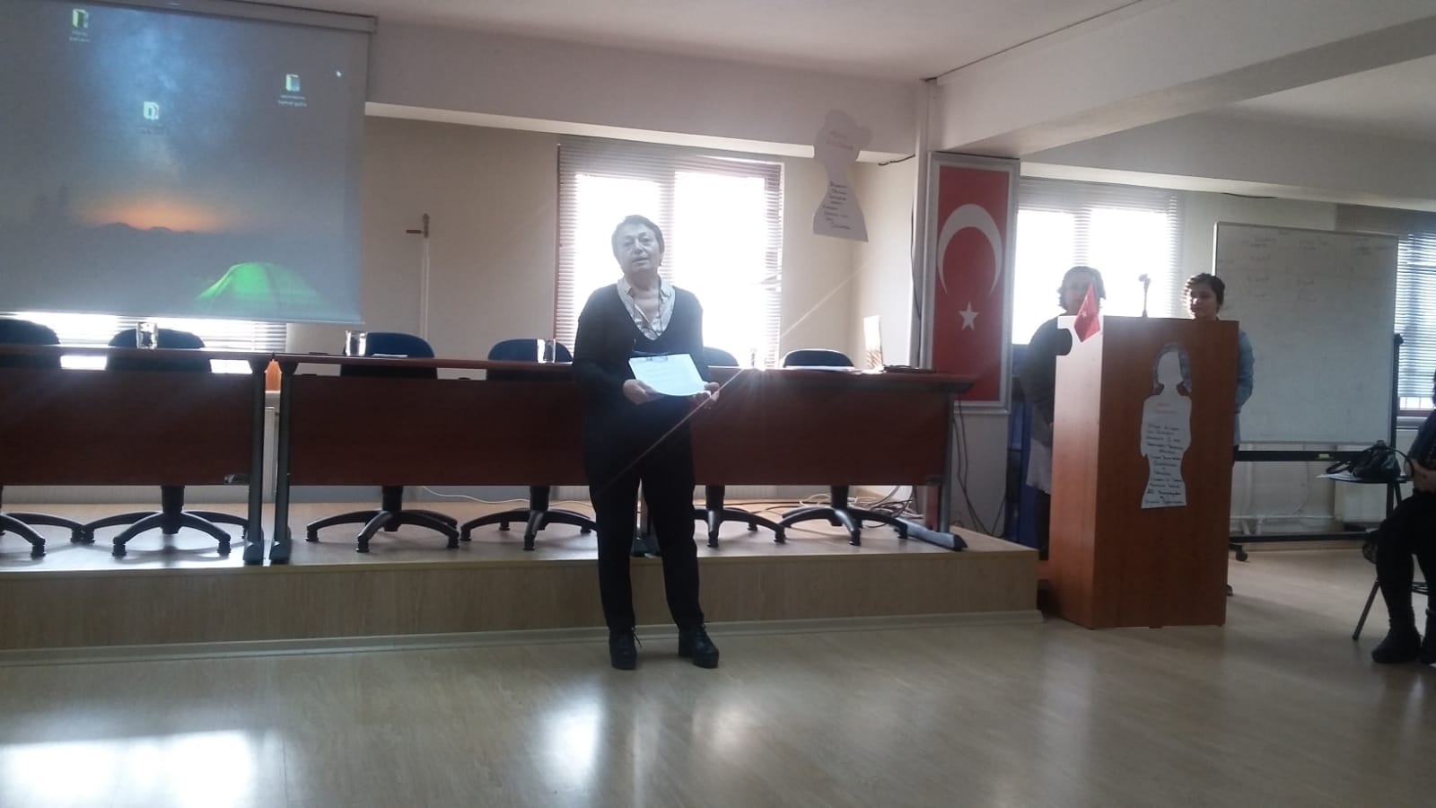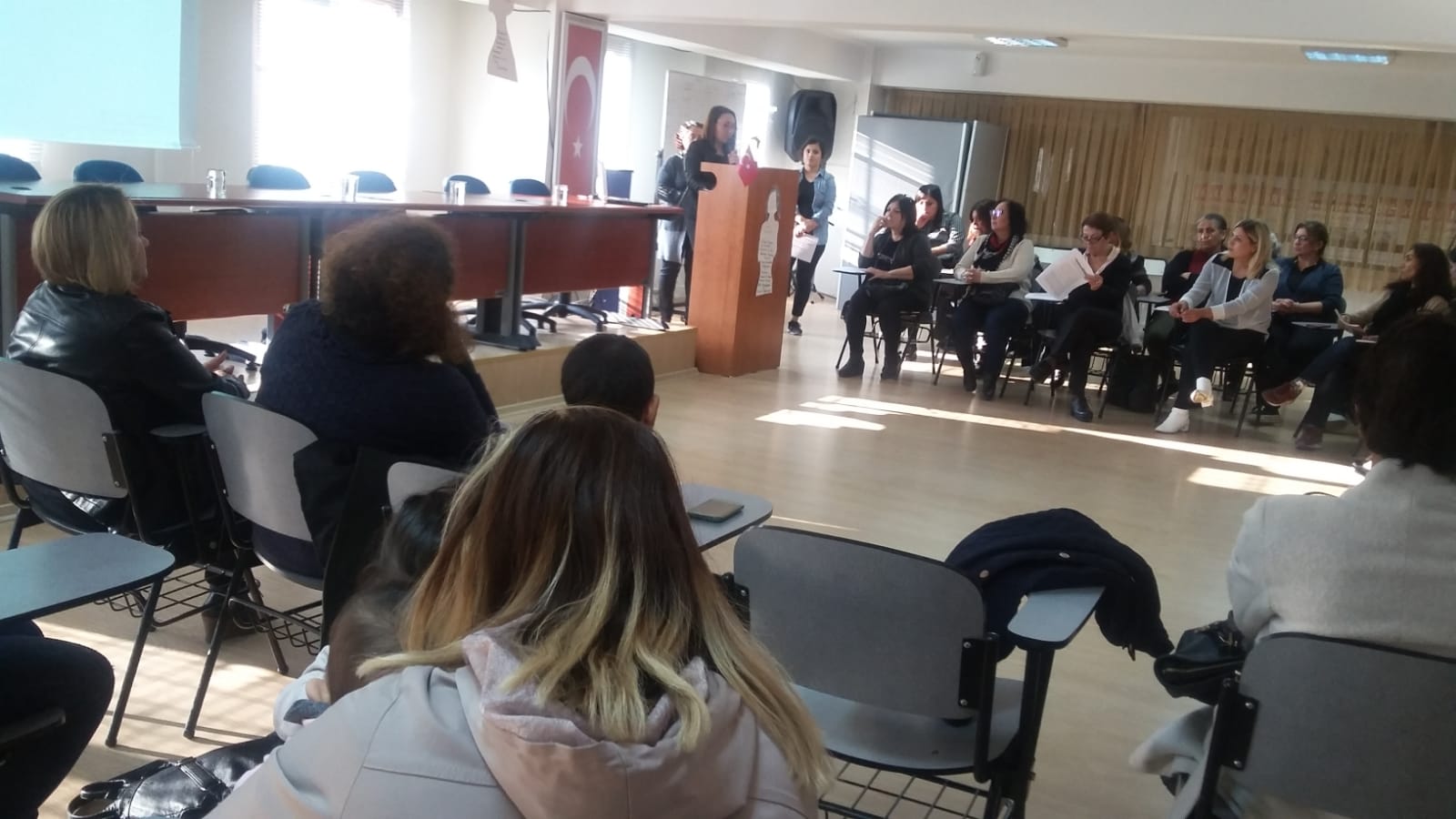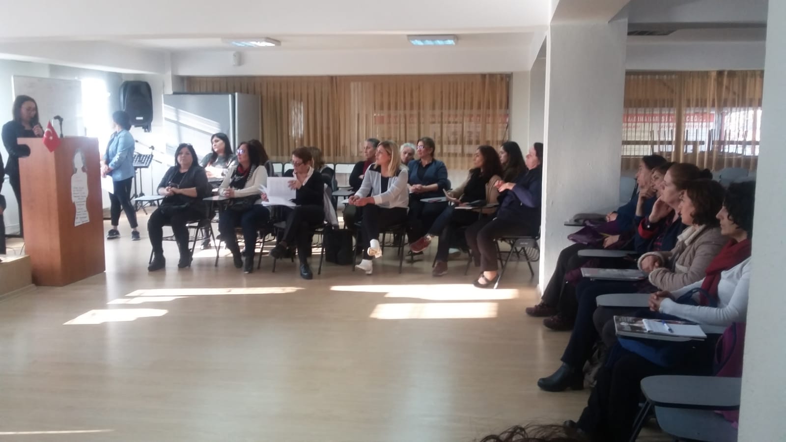 Konuşmanın ardından kısa bir şiir dinletisi oldu. Ardından Av. Cevriye Aydın kadınların hukuksal olarak neler yapması gerektiği üzerinde durdu. Aydın, kadınların birbiriyle dayanışması gerektiğinin altını çizdi. Kadınların, kimliğinden, inancından, giyiminden dolayı ötekileştirildiğini belirten Aydın, kadınların birlikte mücadele etmesi gerektiğini söyledi.