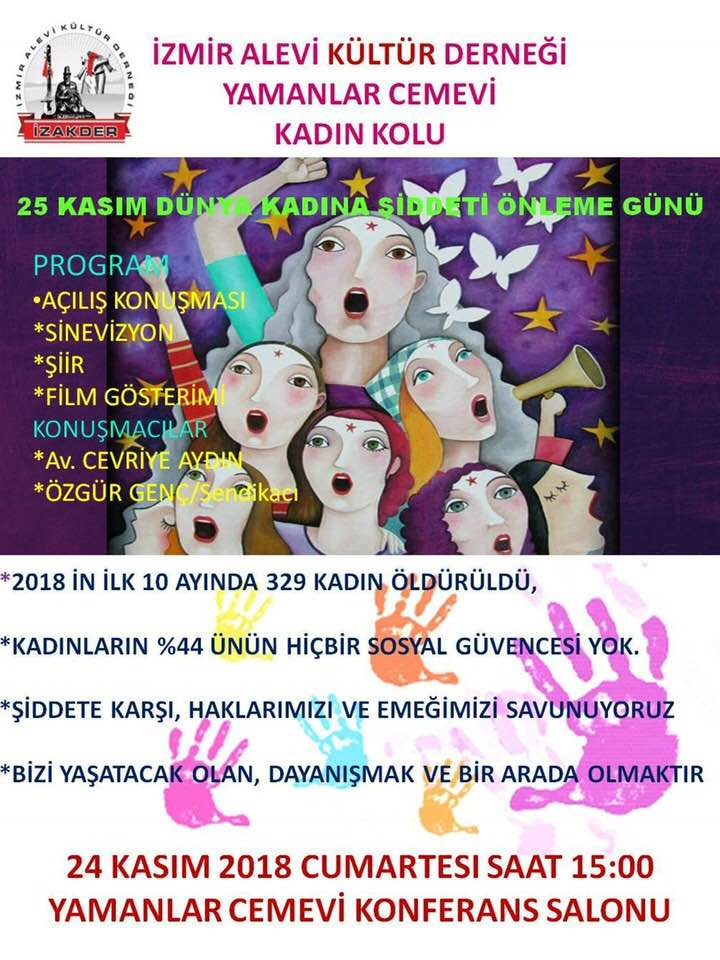 PİRHA – İzmir Alevi Kültür Derneği Yamanlar Cemevi Kadın Kolları, 24 Kasım Cumartesi günü cemevi konferans salonunda sinevizyon gösterimi ve panel yapılacak.