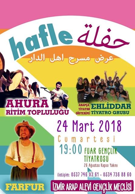 İzmir Arap Alevi Gençlik Meclisi, geleneksel Hafle etkinliğini 16 Mart(Yarın) gerçekleştirecek. Saat: 19.00’da başlayacak etkinlikte Arapça tiyatrolarıyla Ehliddar tiyatro ekibi, stand-up ile Farfur ve türküleriyle halaylarıyla İzmir müzisyenler derneği yer alacak.