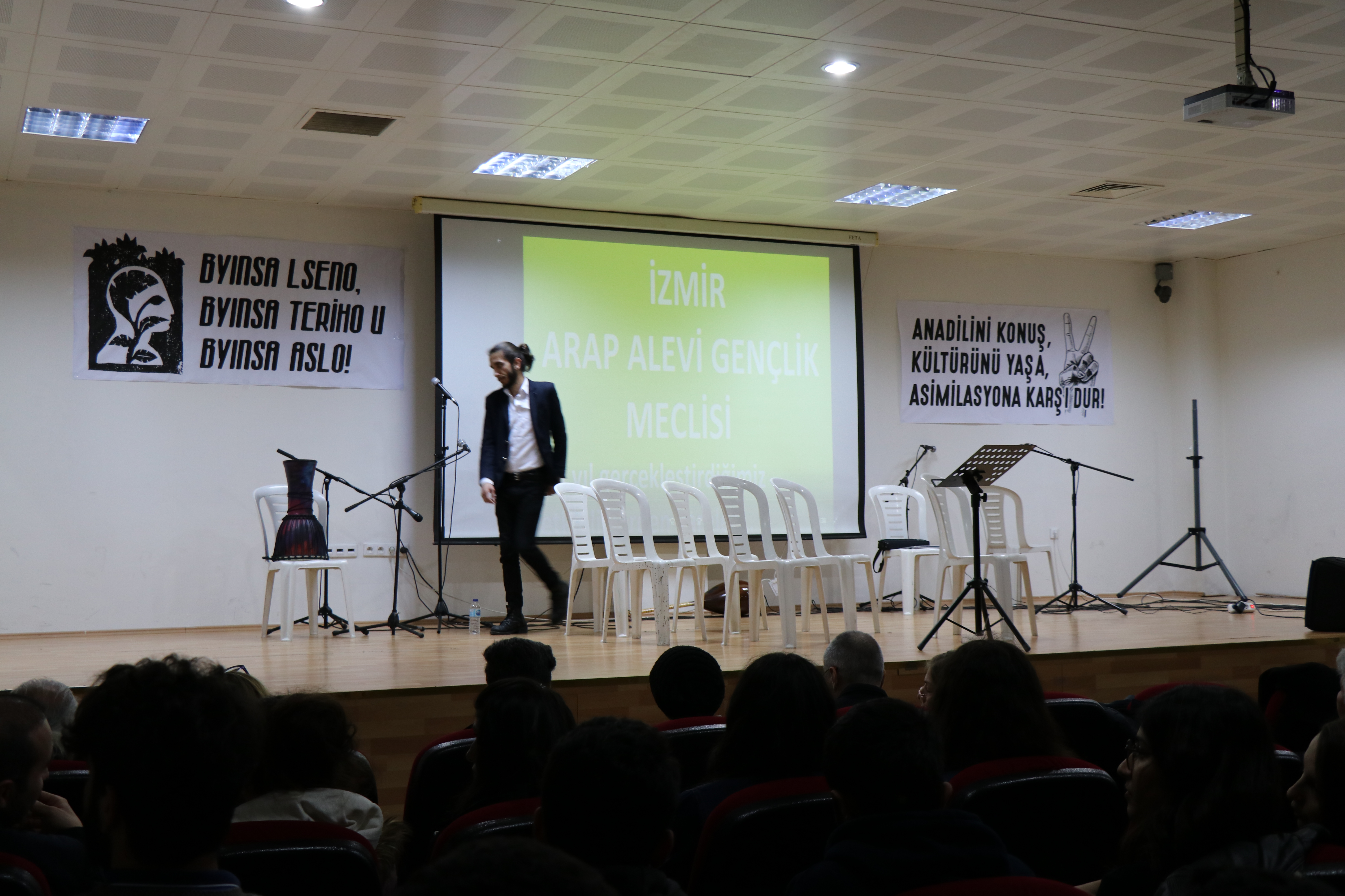 PİRHA- İzmir Arap Alevi Gençlik Meclisi sanatçı Farfur, Ehliddar tiyatro grubu ve İzmir Müzisyenler Derneği’nin katılımıyla ‘Hafle’ etkinliği düzenledi. Etkinlikte İzmir Arap Alevi gençlik Meclisi adına konuşan Umut Oruç Can, asimilasyon politikalarına dikkat çekerek anadili yaşatma çağrısında bulundu.