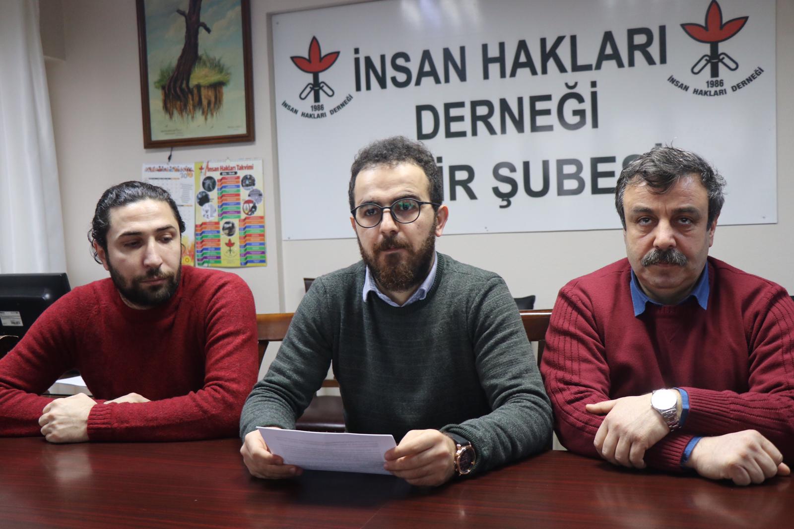 İnsan Hakları Derneği İzmir Şubesi, Çağdaş Hukukçular Derneği, Özgürlük İçin Hukukçular Derneği, Türkiye İnsan Hakları Vakfı İzmir Temsilciliği ve EGE TUHAYDER’in ortak düzenlediği açıklamayı İHD İzmir Şube Başkanı Zafer İncin okudu.